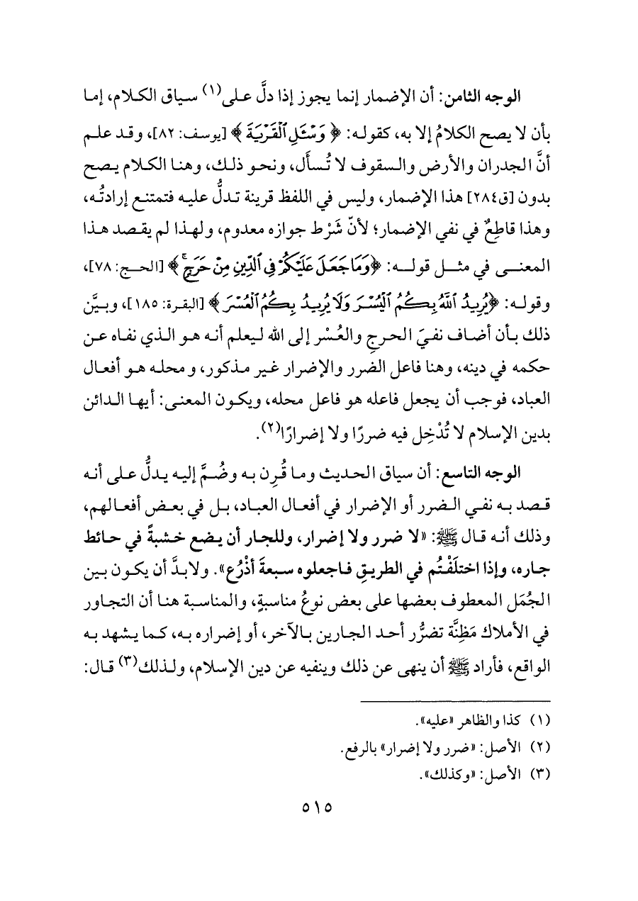 الوجه الثامن: أن الإضمار إنما يجوز إذا دلَّ على (¬١) سياق الكلام، إما بأن لا يصح الكلامُ إلا به، كقوله: {وَاسْأَلِ الْقَرْيَةَ} [يوسف: ٨٢]، وقد علم أنَّ الجدران والأرض والسقوف لا تُسأَل، ونحو ذلك، وهنا الكلام يصح بدون [ق ٢٨٤] هذا الإضمار، وليس في اللفظ قرينة تدلُّ عليه فتمتنع إرادتُه، وهذا قاطِعٌ في نفي الإضمار؛ لأنّ شَرْط جوازه معدوم، ولهذا لم يقصد هذا المعنى في مثل قوله: {وَمَا جَعَلَ عَلَيْكُمْ فِي الدِّينِ مِنْ حَرَجٍ} [الحج: ٧٨]، وقوله: {يُرِيدُ اللَّهُ بِكُمُ الْيُسْرَ وَلَا يُرِيدُ بِكُمُ الْعُسْرَ} [البقرة: ١٨٥]، وبيَّن ذلك بأن أضاف نفيَ الحرجِ والعُسْر إلى الله ليعلم أنه هو الذي نفاه عن حكمه في دينه، وهنا فاعل الضرر والإضرار غير مذكور، ومحله هو أفعال العباد، فوجب أن يجعل فاعله هو فاعل محله، ويكون المعنى: أيها الدائن بدين الإسلام لا تُدْخِل فيه ضررًا ولا إضرارًا (¬٢).