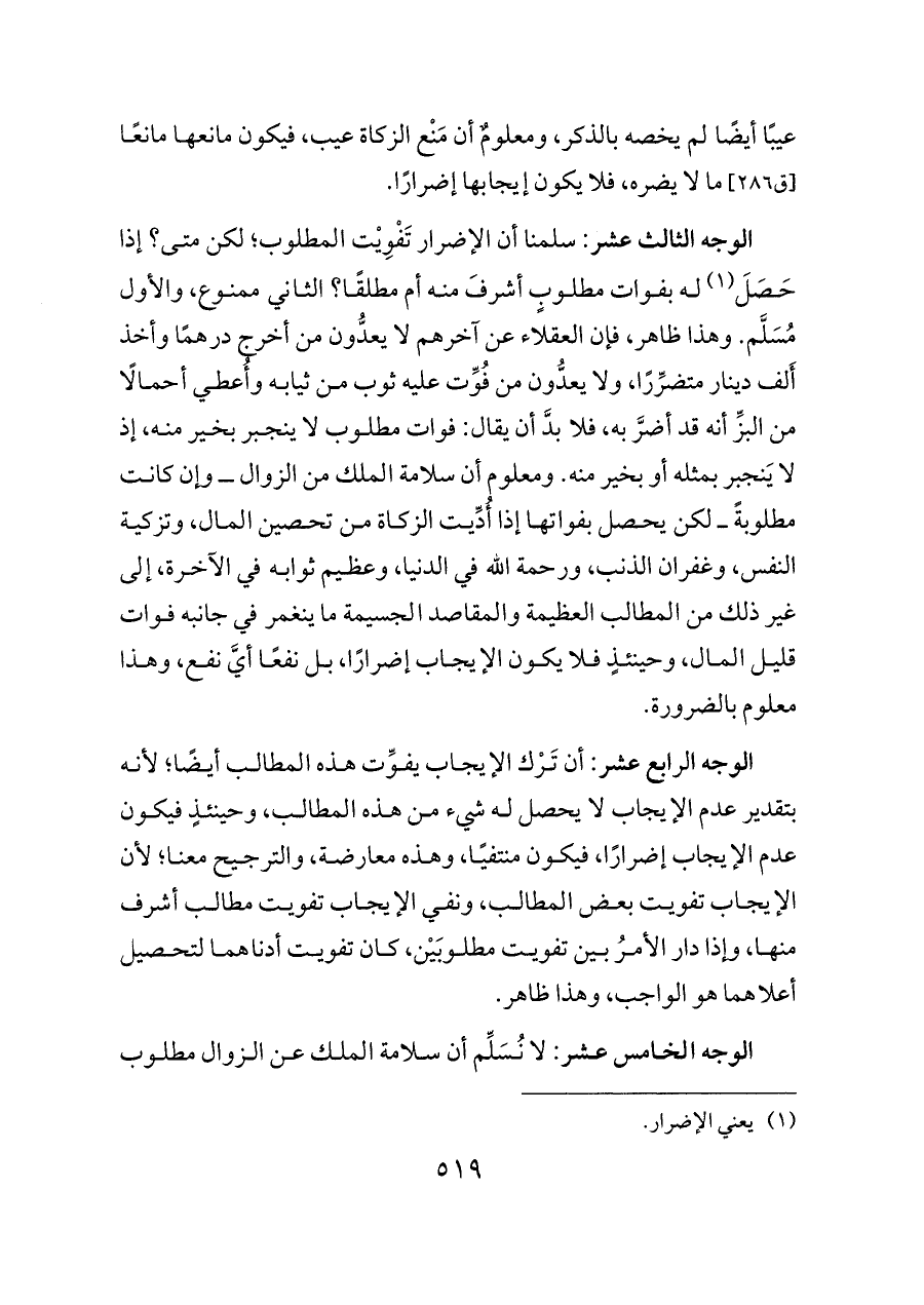 الوجه الثالث عشر: سلمنا أن الإضرار تَفْوِيْت المطلوب؛ لكن متى؟ إذا حَصَلَ (¬١) له بفوات مطلوبٍ أشرفَ منه أم مطلقًا؟ الثاني ممنوع، والأول مُسَلَّم. وهذا ظاهر، فإن العقلاء عن آخرهم لا يعدُّون من أخرج درهمًا وأخذ أَلف دينار متضرِّرًا، ولا يعدُّون من فُوِّت عليه ثوب من ثيابه وأُعطي أحمالًا من البزِّ أنه قد أضرَّ به، فلا بدَّ أن يقال: فوات مطلوب لا ينجبر بخير منه، إذ لا يَنجبر بمثله أو بخير منه. ومعلوم أن سلامة الملك من الزوال ــ وإن كانت مطلوبةً ــ لكن يحصل بفواتها إذا أُدِّيت الزكاة من تحصين المال، وتزكية النفس، وغفران الذنب، ورحمة الله في الدنيا، وعظيم ثوابه في الآخرة، إلى غير ذلك من المطالب العظيمة والمقاصد الجسيمة ما ينغمر في جانبه فوات قليل المال، وحينئذٍ فلا يكون الإيجاب إضرارًا، بل نفعًا أيَّ نفع، وهذا معلوم بالضرورة.
