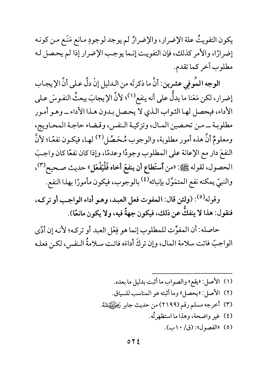 الوجه المُوفِي عشرين: أنَّ ما ذكرتَه من الدليل إنْ دلَّ على أنَّ الإيجاب إضرار، لكن مَعَنا ما يدلُّ على أنه ينفع (¬١)؛ لأنَّ الإيجابَ يبعثُ النفوسَ على الأداء، فيحصل لها الثواب الذي لا يحصل بدون هذا الأداء ــ وهو أمور مطلوبة ــ من تحصين المال، وتزكية النفس، وقضاء حاجة المحاويج، ومعلومٌ أنَّ هذه أمور مطلوبة، والوجوب مُحَصِّل (¬٢) لها، فيكون نفعًا؛ لأنَّ النفعَ دار مع الإعانة على المطلوب وجودًا وعدمًا، وإذا كان نفعًا كان واجبَ الحصول، لقوله - صلى الله عليه وسلم -: «من استَطاع أن ينفعَ أخاه فَلْيَفْعَل» حديث صحيح (¬٣)، والنبيّ يمكنه نفع المتمَوِّل بإنبائه (¬٤) بالوجوب، فيكون مأمورًا بهذا النفع.