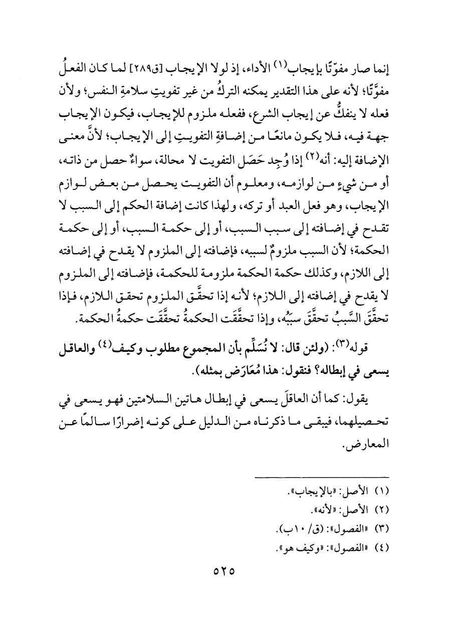 إنما صار مفوّتًا بإيجاب (¬١) الأداء، إذ لولا الإيجاب [ق ٢٨٩] لما كان الفعلُ مفوَّتًا؛ لأنه على هذا التقدير يمكنه التركُ من غير تفويتِ سلامةِ النفس؛ ولأن فعله لا ينفكُّ عن إيجاب الشرع، ففعله ملزوم للإيجاب، فيكون الإيجاب جهة فيه، فلا يكون مانعًا من إضافةِ التفويتِ إلى الإيجاب؛ لأنَّ معنى الإضافة إليه: أنه (¬٢) إذا وُجِد حَصَل التفويت لا محالة، سواءٌ حصل من ذاته، أو من شيءٍ من لوازمه، ومعلوم أن التفويت يحصل من بعض لوازم الإيجاب، وهو فعل العبد أو تركه، ولهذا كانت إضافة الحكم إلى السبب لا تقدح في إضافته إلى سبب السبب، أو إلى حكمة السبب، أو إلى حكمة الحكمة؛ لأن السبب ملزومٌ لسببه، فإضافته إلى الملزوم لا يقدح في إضافته إلى اللازم، وكذلك حكمة الحكمة ملزومة للحكمة، فإضافته إلى الملزوم لا يقدح في إضافته إلى اللازم؛ لأنه إذا تحقَّق الملزوم تحقق اللازم، فإذا تحقَّقَ السَّببُ تحقَّقَ سبَبُه، وإذا تحقَّقَت الحكمةُ تحقَّقَت حكمةُ الحكمة.