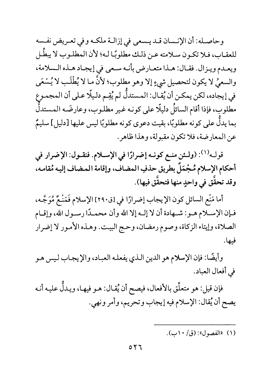 أما مَنْع السائل كون الإيجاب إضرارًا في [ق ٢٩٠] الإسلام فَمَنْعٌ مُوَجَّه، فإن الإسلام هو: شهادة أن لا إله إلا الله وأن محمدًا رسول الله، وإقام الصلاة، وإيتاء الزكاة، وصوم رمضان، وحج البيت. وهذه الأمور لا إضرار فيها.