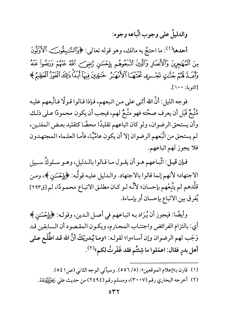 فوجه الليل: أنَّ الله أثنى على من اتبعهم، فإذا قالوا قولًا فاتَّبعهم عليه مُتَّبِعٌ قَبْل أن يعرف صحَّته فهو متَّبعٌ لهم، فيجب أن يكون محمودًا على ذلك وأن يستحق الرضوان، ولو كان اتباعهم تقليدًا محضًا كتقليد بعض المفتين، لم يستحق من اتَّبَعهم الرضوان إلا أن يكون عامِّيًّا، فأما العلماء المجتهدون فلا يجوز لهم اتباعهم.