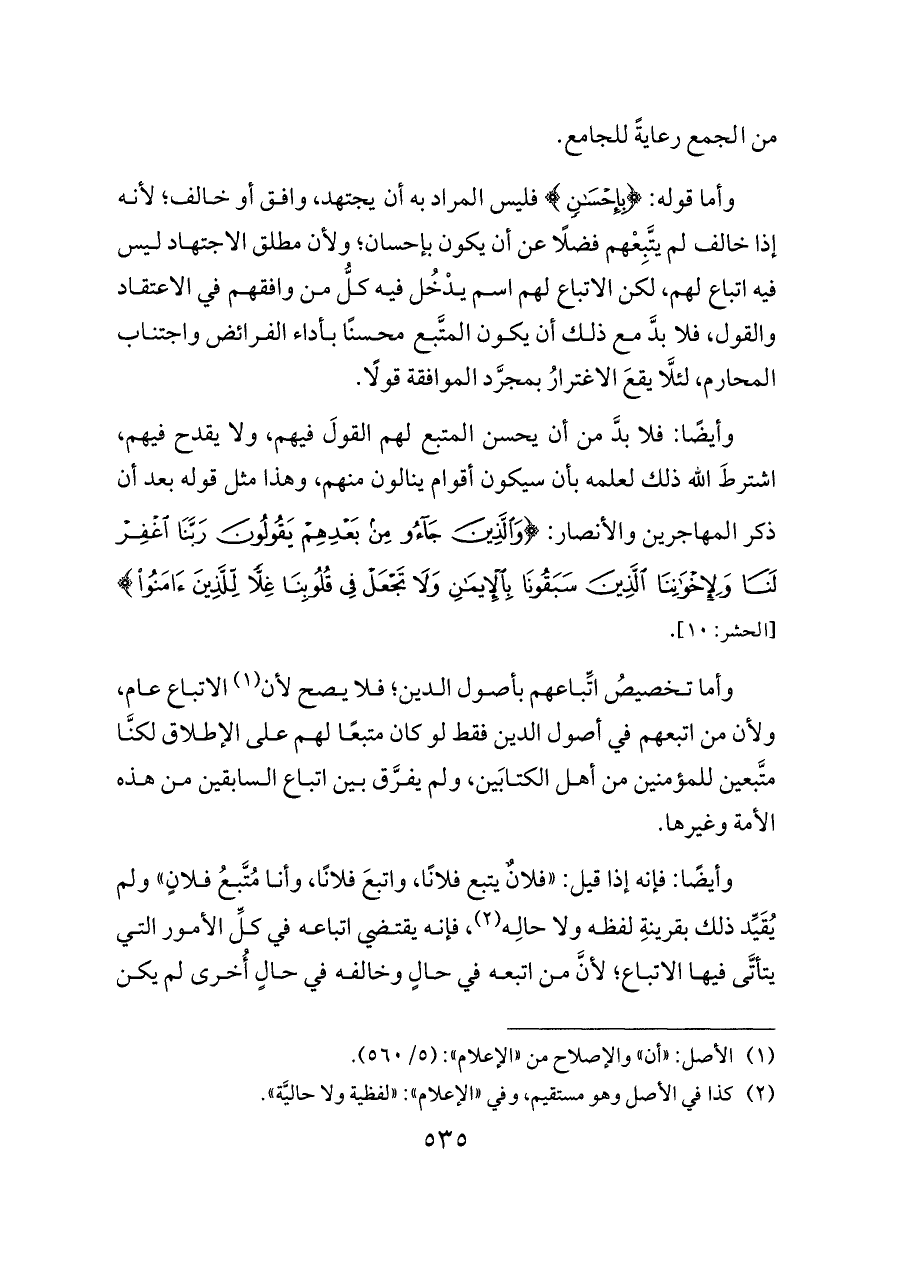 وأما قوله: {بِإِحْسَانٍ} فليس المراد به أن يجتهد، وافق أو خالف؛ لأنه إذا خالف لم يتَّبِعْهم فضلًا عن أن يكون بإحسان؛ ولأن مطلق الاجتهاد ليس فيه اتباع لهم، لكن الاتباع لهم اسم يدْخُل فيه كلُّ من وافقهم في الاعتقاد والقول، فلا بدَّ مع ذلك أن يكون المتَّبع محسنًا بأداء الفرائض واجتناب المحارم، لئلَّا يقعَ الاغترارُ بمجرَّد الموافقة قولًا.