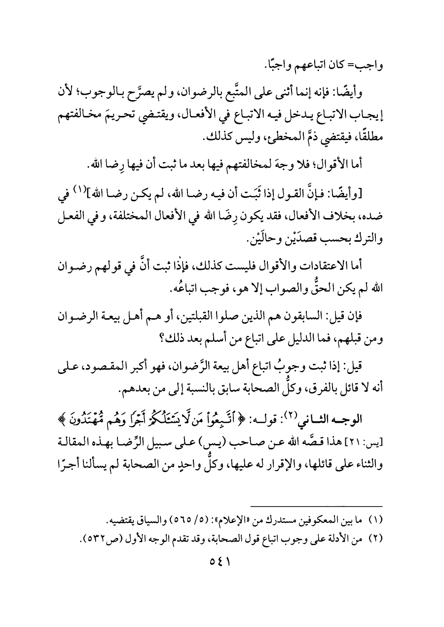 وأيضًا: فإنه إنما أثنى على المتَّبع بالرضوان، ولم يصرَّح بالوجوب؛ لأن إيجاب الاتباع يدخل فيه الاتباع في الأفعال، ويقتضي تحريمَ مخالفتهم مطلقًا، فيقتضي ذمَّ المخطئ، وليس كذلك.