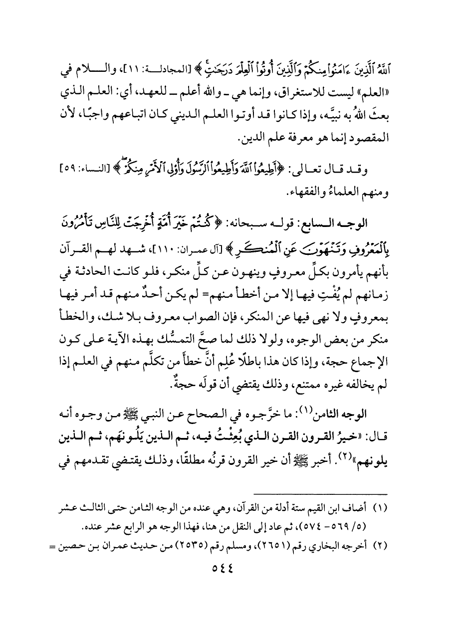 الوجه السابع: قوله سبحانه: {كُنْتُمْ خَيْرَ أُمَّةٍ أُخْرِجَتْ لِلنَّاسِ تَأْمُرُونَ بِالْمَعْرُوفِ وَتَنْهَوْنَ عَنِ الْمُنْكَرِ} [آل عمران: ١١٠]، شهد لهم القرآن بأنهم يأمرون بكلِّ معروفٍ وينهون عن كلِّ منكر، فلو كانت الحادثة في زمانهم لم يُفْتِ فيها إلا من أخطأ منهم= لم يكن أحدٌ منهم قد أمر فيها بمعروفٍ ولا نهى فيها عن المنكر، فإن الصواب معروف بلا شك، والخطأ منكر من بعض الوجوه، ولولا ذلك لما صحَّ التمسُّك بهذه الآية على كون الإجماع حجة، وإذا كان هذا باطلًا عُلِم أنَّ خطأَ من تكلَّم منهم في العلم إذا لم يخالفه غيره ممتنع، وذلك يقتضي أن قولَه حجةٌ.