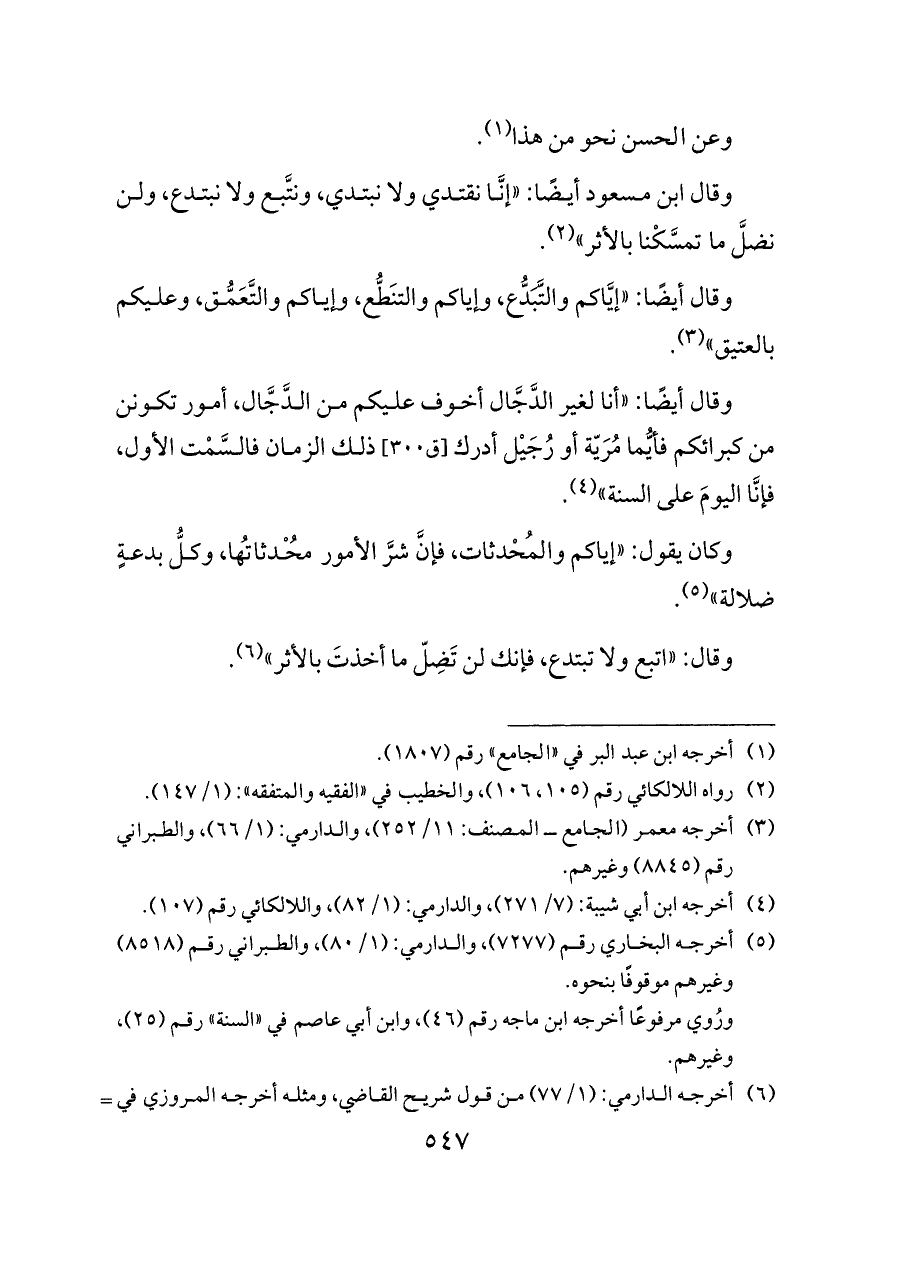 (¬٤) أخرجه ابن أبي شيبة: (٧/ ٢٧١)، والدارمي: (١/ ٨٢)، واللالكائي رقم (١٠٧).