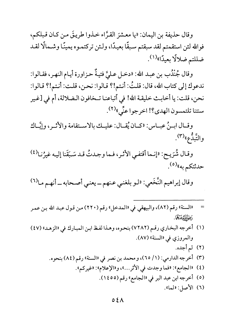 وقال ابنُ عباس: «كان يُقال: عليك بالاستقامة والأثر، وإيَّاك والتَّبدُّع» (¬٣).