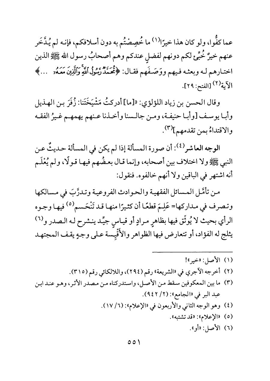 وقال الحسن بن زياد اللؤلؤي: «[ما] أدركتُ مَشْيَخَتَنا: زُفَرَ بن الهذيل وأبا يوسف [وأبا حنيفة، ومن جالسنا وأخذنا عنهم يهمهم غيرُ الفقه والاقتداءُ بمن تقدمهم] (¬٣).
