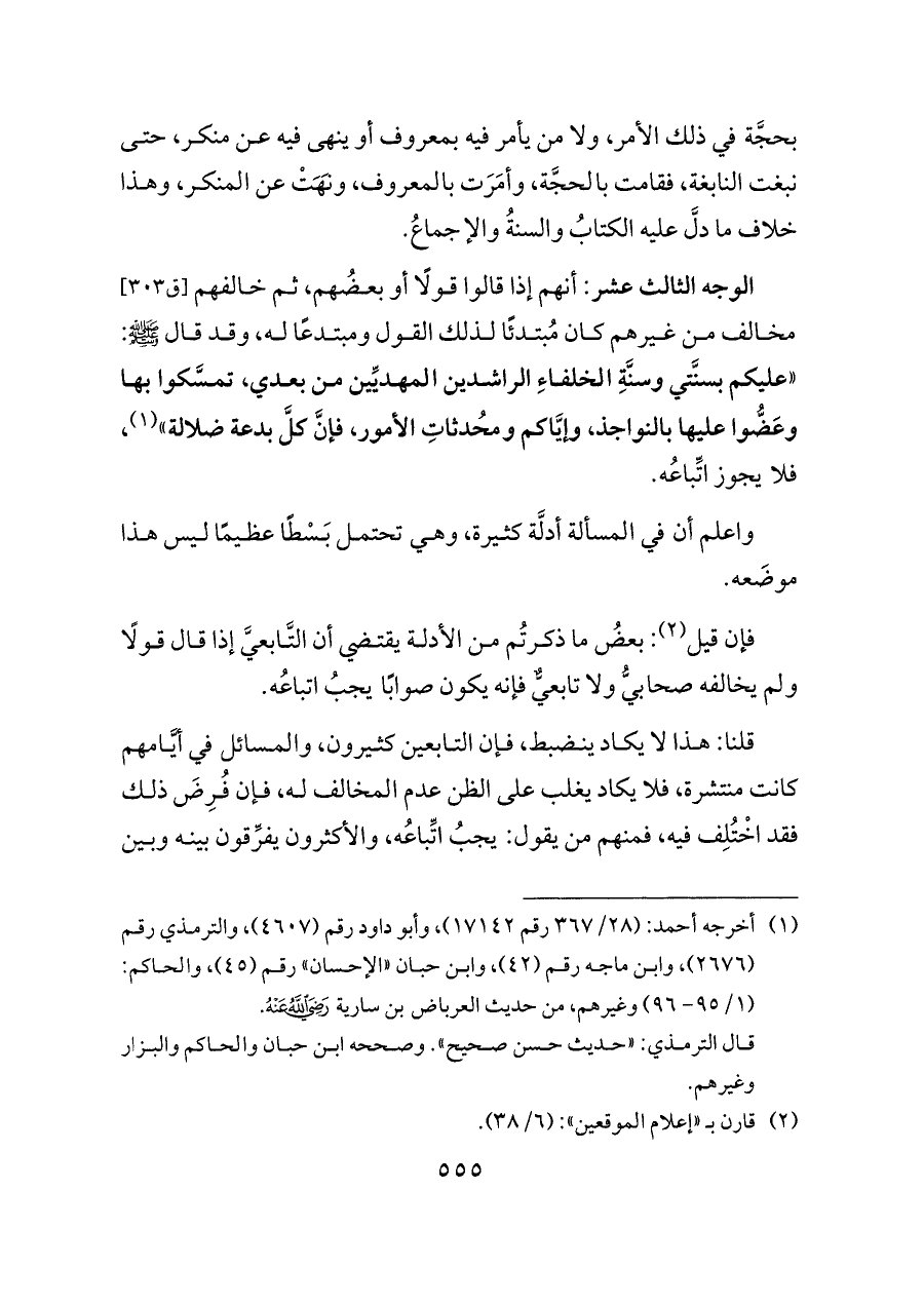 الوجه الثالث عشر: أنهم إذا قالوا قولًا أو بعضُهم، ثم خالفهم [ق ٣٠٣] مخالف من غيرهم كان مُبتدئًا لذلك القول ومبتدعًا له، وقد قال - صلى الله عليه وسلم -: «عليكم بسنَّتي وسنَّةِ الخلفاءِ الراشدين المهديِّين من بعدي، تمسَّكوا بها وعَضُّوا عليها بالنواجذ، وإيَّاكم ومُحدثاتِ الأمور، فإنَّ كلَّ بدعة ضلالة» (¬٢)، فلا يجوز اتِّباعُه.