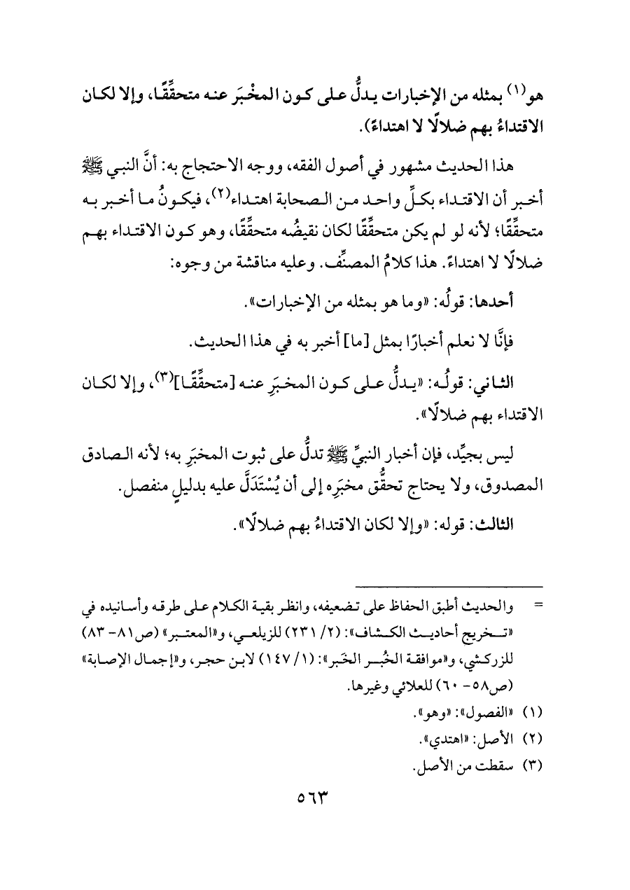 هذا الحديث مشهور في أصول الفقه، ووجه الاحتجاج به: أنَّ النبي - صلى الله عليه وسلم - أخبر أن الاقتداء بكلِّ واحد من الصحابة اهتداء (¬٢)، فيكونُ ما أخبر به متحقِّقًا؛ لأنه لو لم يكن متحقِّقًا لكان نقيضُه متحقِّقًا، وهو كون الاقتداء بهم ضلالًا لا اهتداءً. هذا كلامُ المصنِّف. وعليه مناقشة من وجوه: