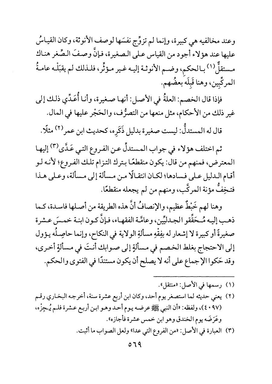 وهنا لهم خَبْطٌ عظيم، والإنصافُ أنَّ هذه الطريقة من أصلها فاسدة، كما ذهب إليه مُحَقِّقو الجدليِّين، وعامَّة الفقهاء، فإنَّ كون ابنة خمسَ عشرة صغيرةً أو كبيرة لا إشعار له بفِقْهِ مسألةِ الولاية في النكاح، وإنما حاصِلُه يؤول إلى الاحتجاج بغلط الخصم في مسألةٍ إلى صوابك أنتَ في مسألةٍ أخرى، وقد حَكوا الإجماع على أنه لا يصلح أن يكون مستندًا في الفتوى والحكم.