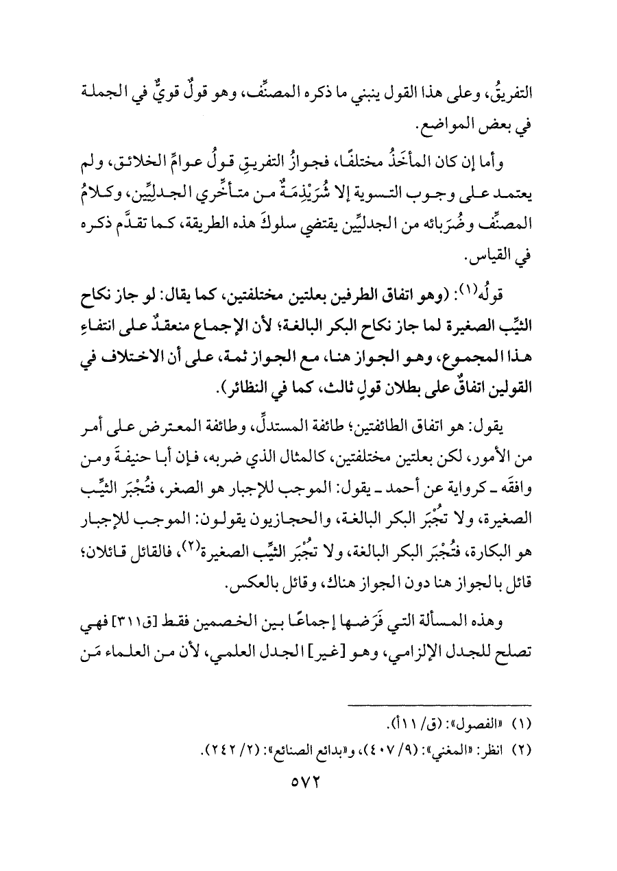 يقول: هو اتفاق الطائفتين؛ طائفة المستدلِّ، وطائفة المعترض على أمر من الأمور، لكن بعلتين مختلفتين، كالمثال الذي ضربه، فإن أبا حنيفةَ ومن وافقَه ــ كرواية عن أحمد ــ يقول: الموجب للإجبار هو الصغر، فتُجْبَر الثيِّب الصغيرة، ولا تُجْبَر البكر البالغة، والحجازيون يقولون: الموجب للإجبار هو البكارة، فتُجْبَر البكر البالغة، ولا تُجْبَر الثيِّب الصغيرة (¬٢)، فالقائل قائلان؛ قائل بالجواز هنا دون الجواز هناك، وقائل بالعكس.