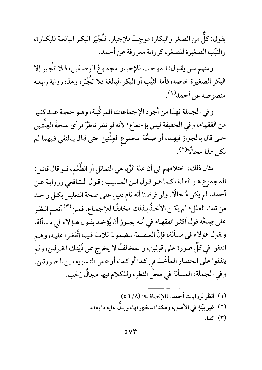 وفي الجملة فهذا من أجود الإجماعات المركَّبة، وهو حجة عند كثير من الفقهاء، وفي الحقيقة ليس بإجماع؛ لأنه لو نظر ناظرٌ فرأى صحةَ العِلَّتين حتى قال بالجواز فيهما، أو صحَّة مجموعِ العِلَّتين حتى قال بالنفي فيهما لم يكن هذا محالًا (¬٢).