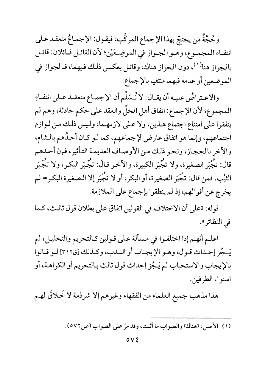 وحُجَّةُ من يحتجّ بهذا الإجماع المركَّب، فيقول: الإجماعُ منعقد على انتفاء المجموع، وهو الجواز في الموضِعَيْن؛ لأن القائل قائلان: قائل بالجواز هنا (¬١)، دون الجواز هناك، وقائل بعكس ذلك فيهما، فالجواز في الموضعين أو عدمه فيهما منتفٍ بالإجماع.