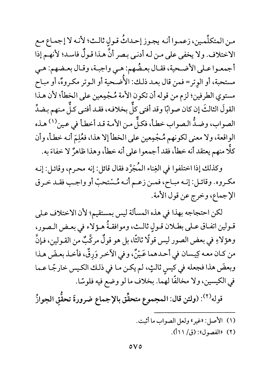 من المتكلِّمين، زعموا أنه يجوز إحداثُ قولٍ ثالث؛ لأنه لا إجماع مع الاختلاف. ولا يخفى على من له أدنى بصر أنَّ هذا قولٌ فاسد؛ لأنهم إذا أجمعوا على الأضحية، فقال بعضُهم: هي واجبة، وقال بعضهم: هي مستحبة، أو الوِتر= فمن قال بعد ذلك: الأُضحية أو الوتر مكروهٌ، أو مباح مستوي الطرفين؛ لزم من قوله أن تكون الأمة مُجْمِعين على الخطأ؛ لأن هذا القولَ الثالثَ إن كان صوابًا وقد أفتى كلٌّ بخلافه، فقد أفتى كلٌّ منهم بضدِّ الصواب، وضدُّ الصواب خطأ، فكلٌّ من الأمة قد أخطأ في عين (¬١) هذه الواقعة، ولا معنى لكونهم مُجْمِعين على الخطأ إلا هذا، فعُلِمَ أنه خطأ، وأن كلًّا منهم يعتقد أنه خطأ، فقد أجمعوا على أنه خطأ، وهذا ظاهرٌ لا خفاءَ به.