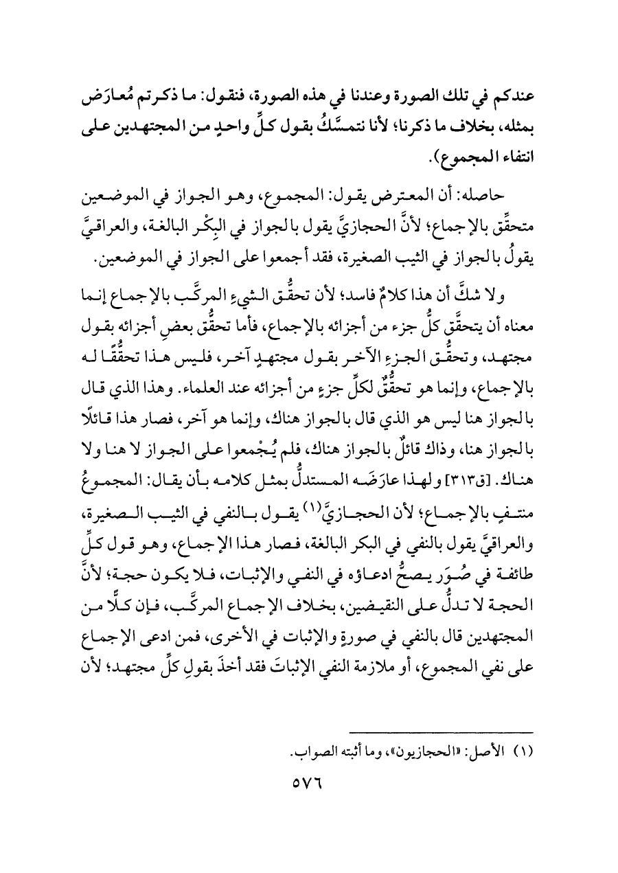 ولا شكَّ أن هذا كلامٌ فاسد؛ لأن تحقُّق الشيءِ المركَّب بالإجماع إنما معناه أن يتحقَّق كلُّ جزء من أجزائه بالإجماع، فأما تحقُّق بعضِ أجزائه بقول مجتهد، وتحقُّق الجزءِ الآخر بقول مجتهدٍ آخر، فليس هذا تحقُّقًا له بالإجماع، وإنما هو تحقُّقٌ لكلِّ جزءٍ من أجزائه عند العلماء. وهذا الذي قال بالجواز هنا ليس هو الذي قال بالجواز هناك، وإنما هو آخر، فصار هذا قائلًا بالجواز هنا، وذاك قائلٌ بالجواز هناك، فلم يُجْمعوا على الجواز لا هنا ولا هناك. [ق ٣١٣] ولهذا عارَضَه المستدلُّ بمثل كلامه بأن يقال: المجموعُ منتفٍ بالإجماع؛ لأن الحجازيَّ (¬١) يقول بالنفي في الثيب الصغيرة، والعراقيَّ يقول بالنفي في البكر البالغة، فصار هذا الإجماع، وهو قول كلِّ طائفة في صُوَر يصحُّ ادعاؤه في النفي والإثبات، فلا يكون حجة؛ لأنَّ الحجة لا تدلُّ على النقيضين، بخلاف الإجماع المركَّب، فإن كلًّا من المجتهدين قال بالنفي في صورةٍ والإثبات في الأخرى، فمن ادعى الإجماع على نفي المجموع، أو ملازمة النفي الإثباتَ فقد أخذَ بقولِ كلِّ مجتهد؛ لأن