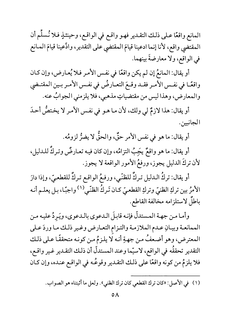 أو يقال: المانعُ إن لم يكن واقعًا في نفس الأمر فلا يُعارض، وإن كان واقعًا في نفس الأمر فقد وقعَ التعارضُ في نفس الأمر بين المقتضي والمعارض، وهذا ليس من مقتضياتِ مذهبي، فلا يلزمني الجوابُ عنه.