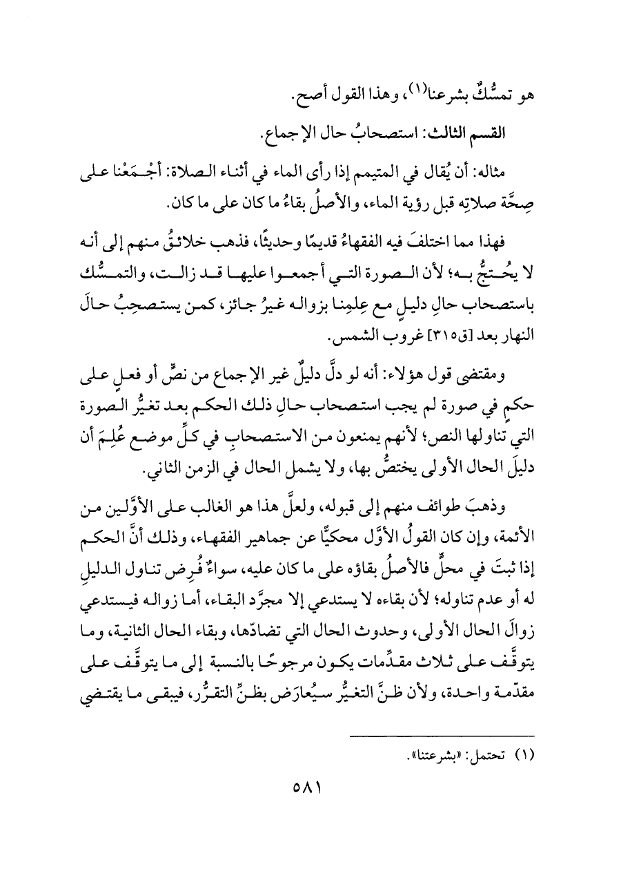 وذهبَ طوائف منهم إلى قبوله، ولعلَّ هذا هو الغالب على الأوَّلين من الأئمة، وإن كان القولُ الأوَّل محكيًّا عن جماهير الفقهاء، وذلك أنَّ الحكم إذا ثبتَ في محلٍّ فالأصلُ بقاؤه على ما كان عليه، سواءٌ فُرِض تناول الدليلِ له أو عدم تناوله؛ لأن بقاءه لا يستدعي إلا مجرَّد البقاء، أما زواله فيستدعي زوالَ الحال الأولى، وحدوث الحال التي تضادّها، وبقاء الحال الثانية، وما يتوقَّف على ثلاث مقدِّمات يكون مرجوحًا بالنسبة إلى ما يتوقَّف على مقدّمة واحدة، ولأن ظنَّ التغيُّر سيُعارَض بظنِّ التقرُّر، فيبقى ما يقتضي