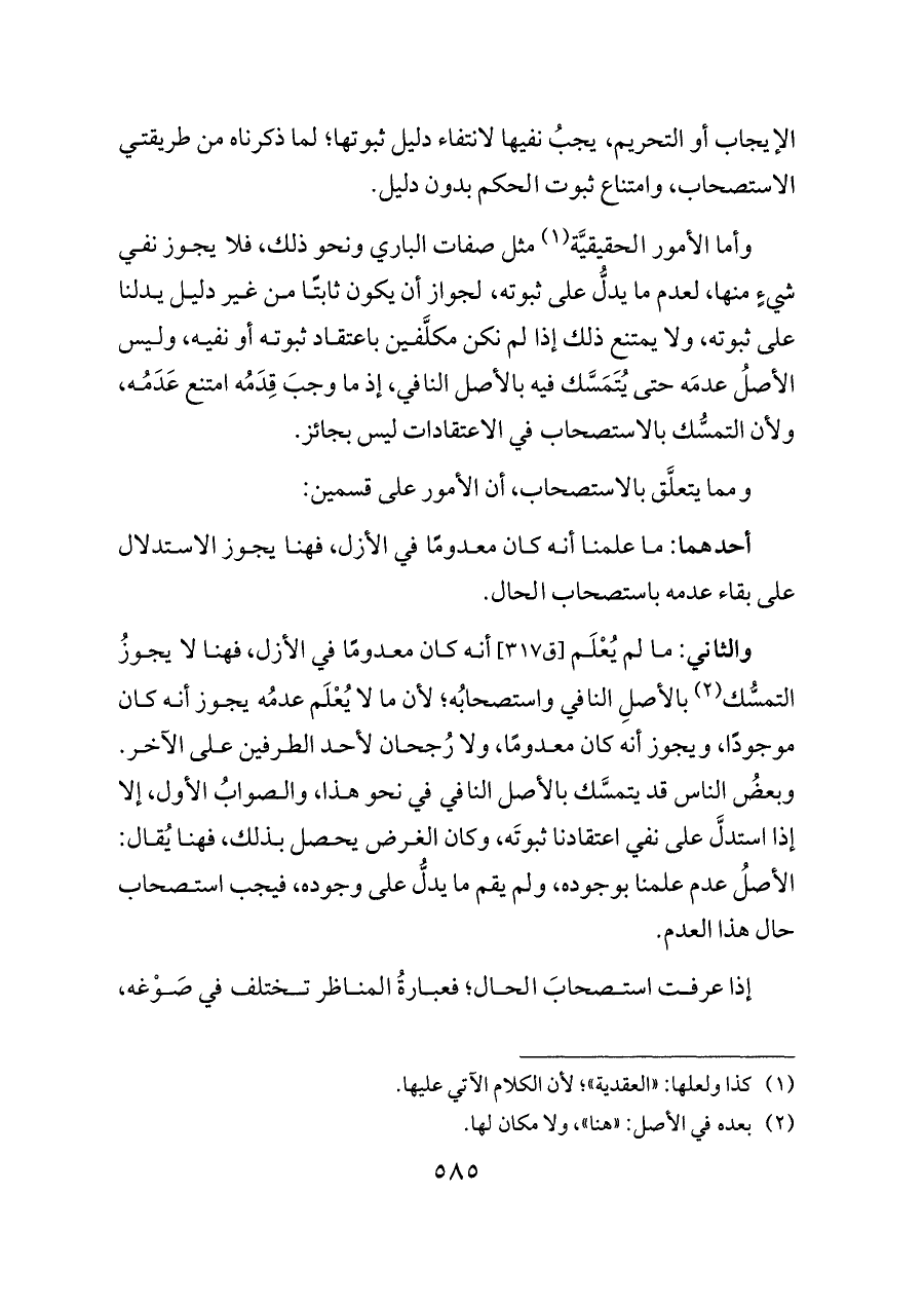 وأما الأمور الحقيقيَّة (¬١) مثل صفات الباري ونحو ذلك، فلا يجوز نفي شيءٍ منها، لعدم ما يدلُّ على ثبوته، لجواز أن يكون ثابتًا من غير دليل يدلنا على ثبوته، ولا يمتنع ذلك إذا لم نكن مكلَّفين باعتقاد ثبوته أو نفيه، وليس الأصلُ عدمَه حتى يُتَمَسَّك فيه بالأصل النافي، إذ ما وجبَ قِدَمُه امتنع عَدَمُه، ولأن التمسُّك بالاستصحاب في الاعتقادات ليس بجائز.