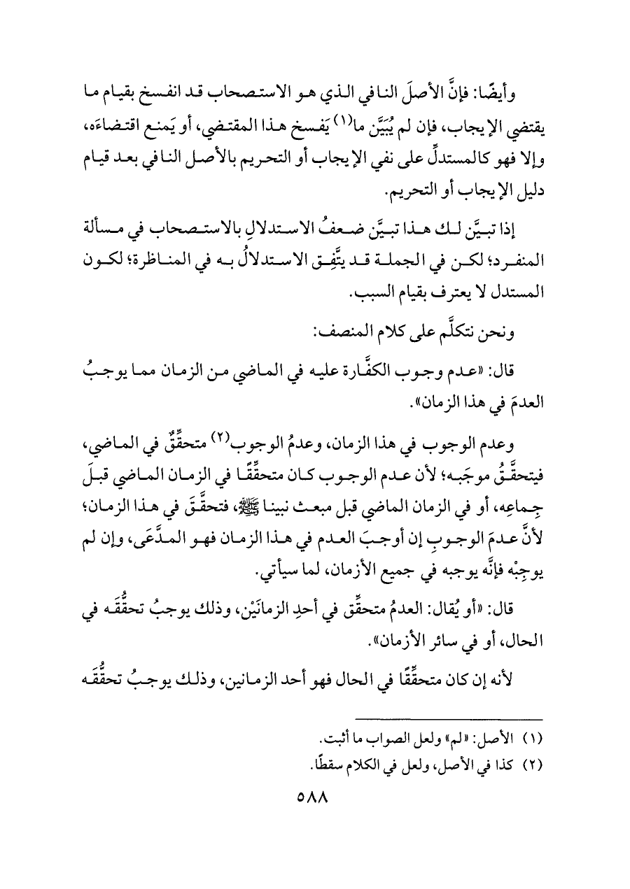 وعدم الوجوب في هذا الزمان، وعدمُ الوجوب (¬٢) متحقِّقٌ في الماضي، فيتحقَّقُ موجَبه؛ لأن عدم الوجوب كان متحقِّقًا في الزمان الماضي قبلَ جِماعِه، أو في الزمان الماضي قبل مبعث نبينا - صلى الله عليه وسلم -، فتحقَّقَ في هذا الزمان؛ لأنَّ عدمَ الوجوبِ إن أوجبَ العدم في هذا الزمان فهو المدَّعَى، وإن لم يوجِبْه فإنَّه يوجبه في جميع الأزمان، لما سيأتي.