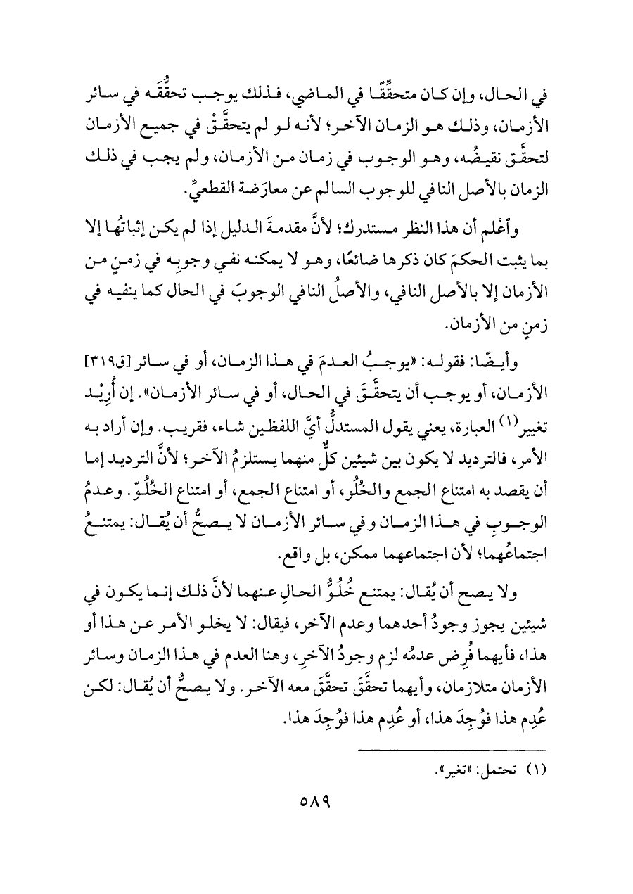 ولا يصح أن يُقال: يمتنع خُلُوُّ الحالِ عنهما لأنَّ ذلك إنما يكون في شيئين يجوز وجودُ أحدهما وعدم الآخر، فيقال: لا يخلو الأمر عن هذا أو هذا، فأيهما فُرِض عدمُه لزم وجودُ الآخرِ، وهنا العدم في هذا الزمان وسائر الأزمان متلازمان، وأيهما تحقَّقَ تحقَّقَ معه الآخر. ولا يصحُّ أن يُقال: لكن عُدِم هذا فوُجِدَ هذا، أو عُدِم هذا فوُجِدَ هذا.