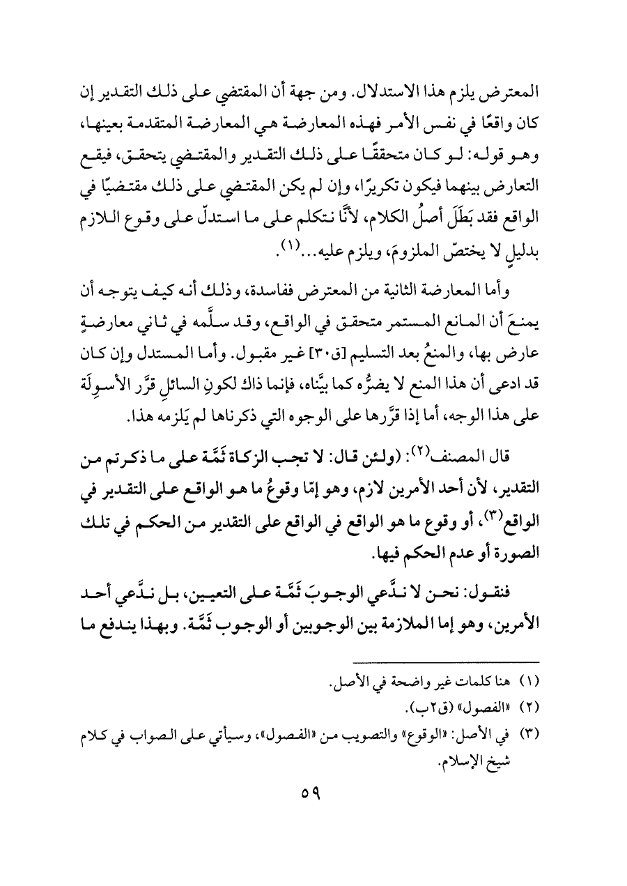 قال المصنف (¬٢): (ولئن قال: لا تجب الزكاة ثَمَّة على ما ذكرتم من التقدير، لأن أحد الأمرين لازم، وهو إمّا وقوعُ ما هو الواقع على التقدير في الواقع (¬٣)، أو وقوع ما هو الواقع في الواقع على التقدير من الحكم في تلك الصورة أو عدم الحكم فيها.