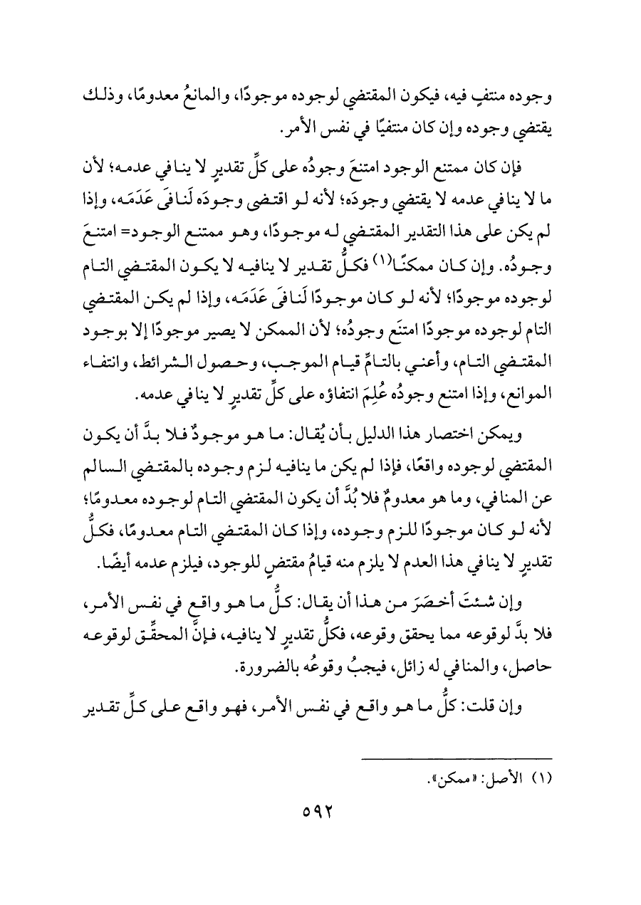 ويمكن اختصار هذا الدليل بأن يُقال: ما هو موجودٌ فلا بدَّ أن يكون المقتضي لوجوده واقعًا، فإذا لم يكن ما ينافيه لزم وجوده بالمقتضي السالم عن المنافي، وما هو معدومٌ فلا بُدَّ أن يكون المقتضي التام لوجوده معدومًا؛ لأنه لو كان موجودًا للزم وجوده، وإذا كان المقتضي التام معدومًا، فكلُّ تقديرٍ لا ينافي هذا العدم لا يلزم منه قيامُ مقتضٍ للوجود، فيلزم عدمه أيضًا.