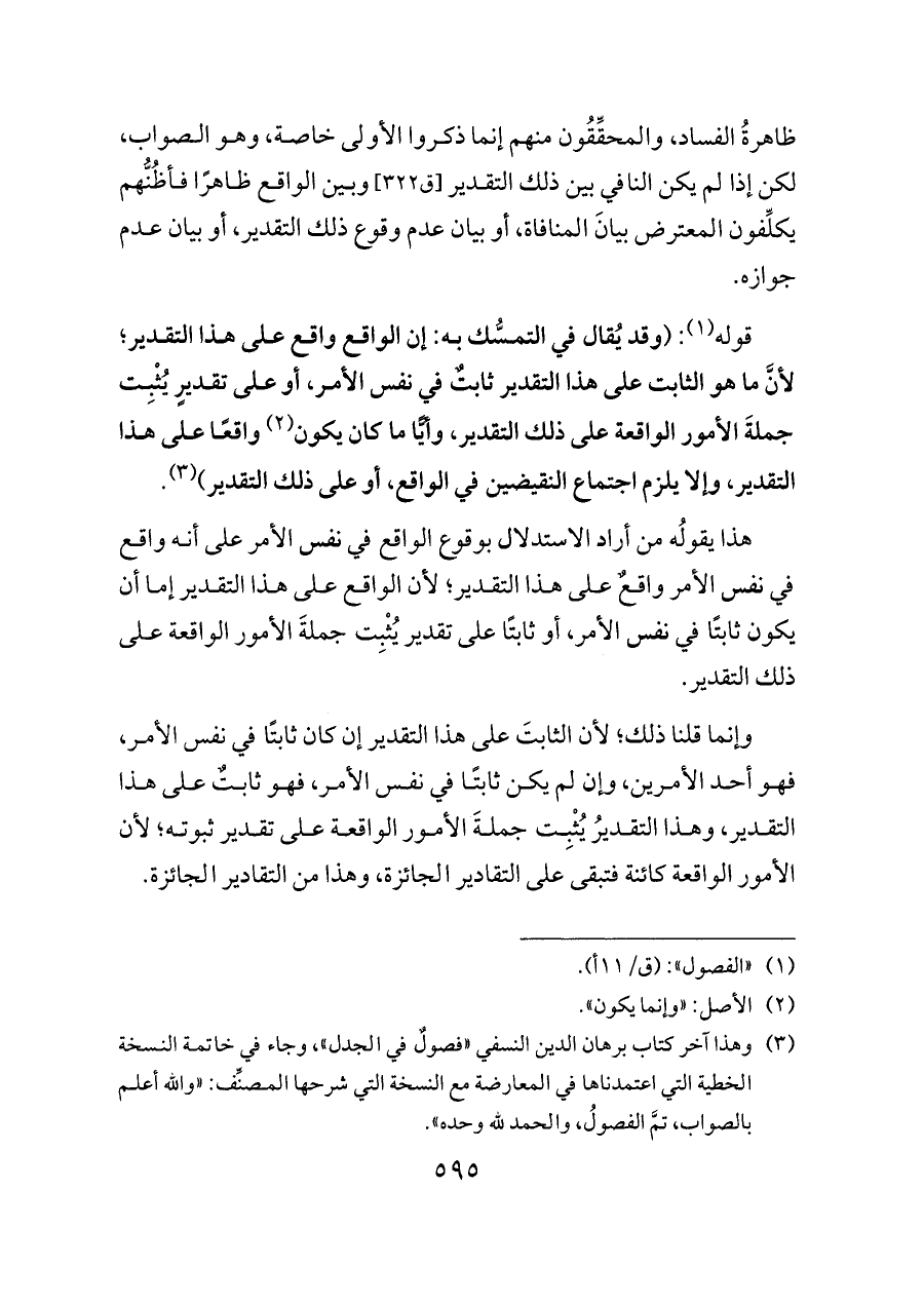 ظاهرةُ الفساد، والمحقِّقُون منهم إنما ذكروا الأولى خاصة، وهو الصواب، لكن إذا لم يكن النافي بين ذلك التقدير [ق ٣٢٢] وبين الواقع ظاهرًا فأظُنُّهم يكلِّفون المعترض بيانَ المنافاة، أو بيان عدم وقوع ذلك التقدير، أو بيان عدم جوازه.