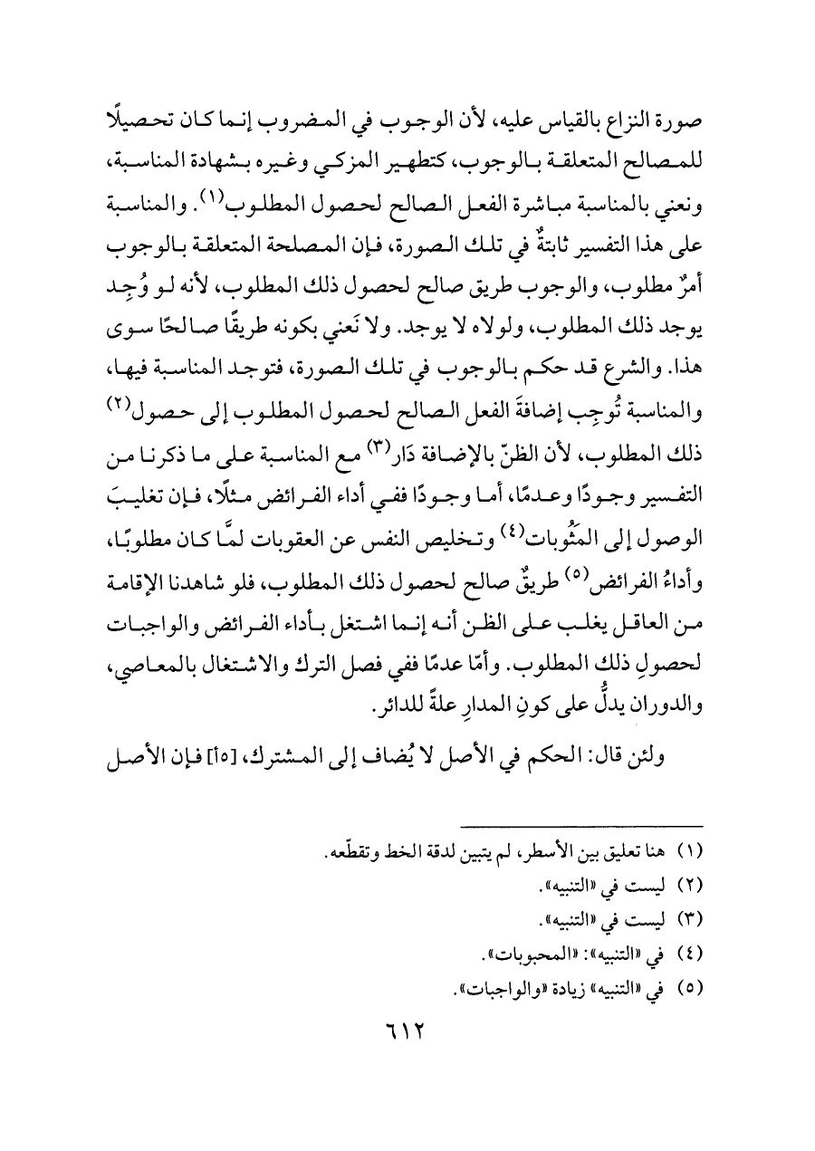 صورة النزاع بالقياس عليه، لأن الوجوب في المضروب إنما كان تحصيلًا للمصالح المتعلقة بالوجوب، كتطهير المزكي وغيره بشهادة المناسبة، ونعني بالمناسبة مباشرة الفعل الصالح لحصول المطلوب (¬١). والمناسبة على هذا التفسير ثابتةٌ في تلك الصورة، فإن المصلحة المتعلقة بالوجوب أمرٌ مطلوب، والوجوب طريق صالح لحصول ذلك المطلوب، لأنه لو وُجِد يوجد ذلك المطلوب، ولولاه لا يوجد. ولا نَعني بكونه طريقًا صالحًا سوى هذا. والشرع قد حكم بالوجوب في تلك الصورة، فتوجد المناسبة فيها، والمناسبة تُوجِب إضافةَ الفعل الصالح لحصول المطلوب إلى حصول (¬٢) ذلك المطلوب، لأن الظنّ بالإضافة دَار (¬٣) مع المناسبة على ما ذكرنا من التفسير وجودًا وعدمًا، أما وجودًا ففي أداء الفرائض مثلًا، فإن تغليبَ الوصول إلى المَثُوبات (¬٤) وتخليص النفس عن العقوبات لمَّا كان مطلوبًا، وأداءُ الفرائض (¬٥) طريقٌ صالح لحصول ذلك المطلوب، فلو شاهدنا الإقامة من العاقل يغلب على الظن أنه إنما اشتغل بأداء الفرائض والواجبات لحصولِ ذلك المطلوب. وأمّا عدمًا ففي فصل الترك والاشتغال بالمعاصي، والدوران يدلُّ على كونِ المدارِ علةً للدائر.
