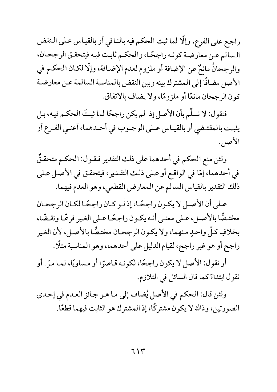 على أن الأصل لا يكون راجحًا، إذ لو كان راجحًا لكان الرجحان مختصًّا بالأصل، على معنى أنه يكون راجحًا على الغير فرعًا ونقضًا، بخلافِ كلّ واحدٍ منهما، ولا يكون الرجحان مختصًّا بالأصل، لأن الغير راجح أو هو غير راجح، لقيام الدليل على أحدهما، وهو المناسبة مثلًا.