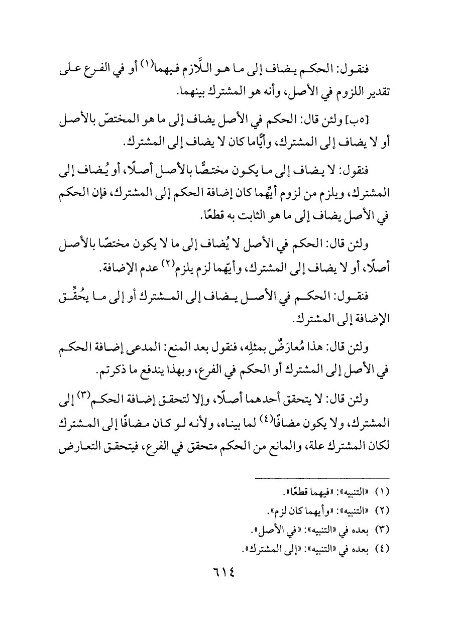 [٥ ب] ولئن قال: الحكم في الأصل يضاف إلى ما هو المختصّ بالأصل أو لا يضاف إلى المشترك، وأيًّاما كان لا يضاف إلى المشترك.