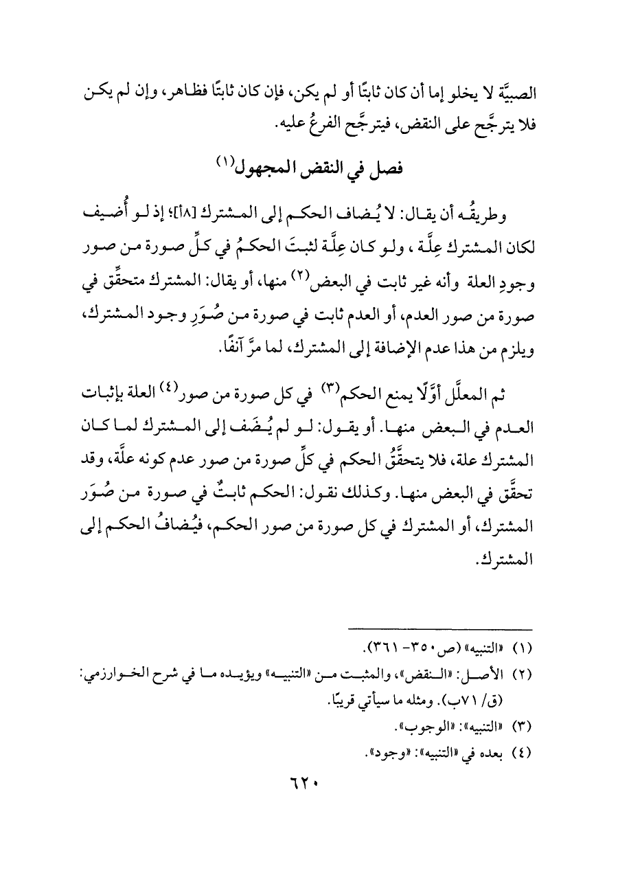 ثم المعلَّل أوَّلًا يمنع الحكم (¬٣) في كل صورة من صور (¬٤) العلة بإثبات العدم في البعض منها. أو يقول: لو لم يُضَف إلى المشترك لما كان المشترك علة، فلا يتحقَّقُ الحكم في كلِّ صورة من صور عدم كونه علَّة، وقد تحقَّق في البعض منها. وكذلك نقول: الحكم ثابتٌ في صورة من صُوَر المشترك، أو المشترك في كل صورة من صور الحكم، فيُضافُ الحكم إلى المشترك.