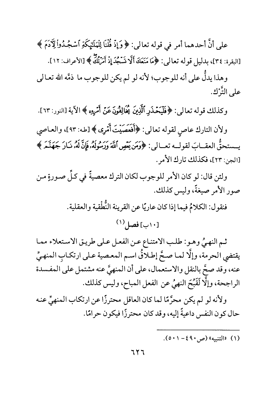 ثم النهيُ وهو: طلب الامتناع عن الفعل على طريق الاستعلاء مما يقتضي الحرمة، وإلَّا لما صحَّ إطلاقُ اسم المعصية على ارتكابِ المنهيِّ عنه، وقد صحَّ بالنقل والاستعمال، على أن المنهيَّ عنه مشتمل على المفسدة الراجحة، وإلَّا لَقَبُحَ النهيُ عن الفعل المباح، وليس كذلك.