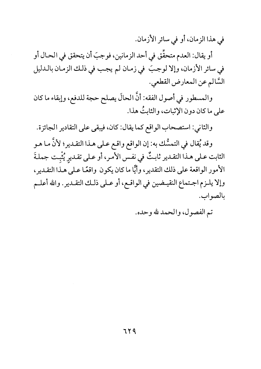 أو يقال: العدم متحقِّق في أحد الزمانين، فوجبَ أن يتحقق في الحال أو في سائر الأزمان، وإلا لوجبَ في زمان لم يجب في ذلك الزمان بالدليل السَّالم عن المعارض القطعي.