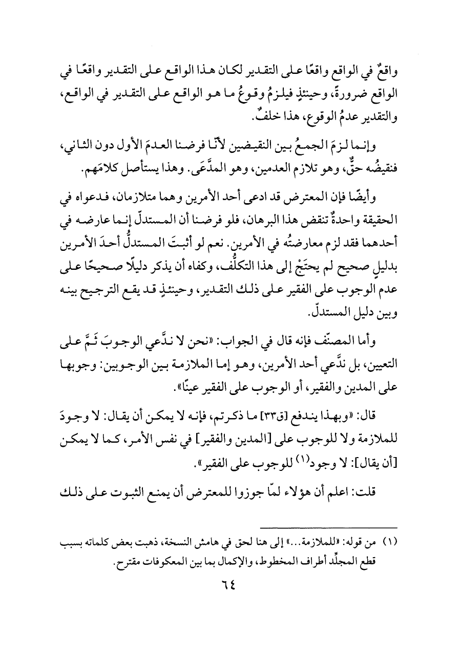 وأيضًا فإن المعترض قد ادعى أحد الأمرين وهما متلازمان، فدعواه في الحقيقة واحدةٌ تنقض هذا البرهان، فلو فرضنا أن المستدلّ إنما عارضه في أحدهما فقد لزم معارضتُه في الأمرين. نعم لو أثبتَ المستدلُّ أحدَ الأمرين بدليلٍ صحيح لم يحتَجْ إلى هذا التكلُّف، وكفاه أن يذكر دليلًا صحيحًا على عدم الوجوب على الفقير على ذلك التقدير، وحينئذٍ قد يقع الترجيح بينه وبين دليل المستدلّ.