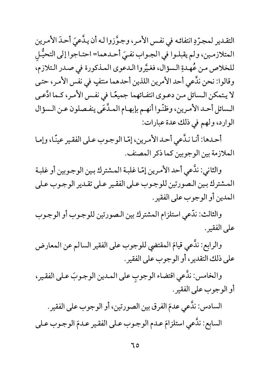 التقدير لمجرّدِ انتفائه في نفس الأمر، وجوَّزوا له أن يدَّعيَ أحدَ الأمرين المتلازمين، ولم يقبلوا في الجواب نفيَ أحدهما= احتاجوا إلى التحيُّلِ للخلاص من عُهدةِ السؤال، فغيَّروا الدعوى المذكورة في صدر التلازم، وقالوا: نحن ندَّعي أحد الأمرين اللذين أحدهما منتفٍ في نفس الأمر، حتى لا يتمكن السائل من دعوى انتفائهما جميعًا في نفس الأمر، كما ادَّعى السائل أحد الأمرين، وظنّوا أنهم بإبهام المدَّعَى ينفصلون عن السؤال الوارد، ولهم في ذلك عدة عبارات: