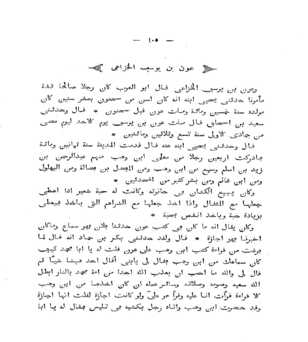 قَالَ أَبُو الْعَرَبِ: وَلَقَدْ حَدَّثَنِي بَكْرُ بْنُ حَمَّادٍ، قَالَ: لَمَّا فَرَغْتُ مِنْ قِرَاءَةِ كُتُبِ ابْنِ وَهْبٍ عَلَى عَوْنٍ، قُلْتُ لَهُ: يَا أَبَا مُحَمَّدٍ، كَيْفَ كَانَ سَمَاعُكَ مِنَ ابْنِ وَهْبٍ؟ فَقَالَ لِي: يَا بُنَيَّ، أَقَالَ أَحَدٌ فِينَا شَيْئًا؟ ثُمَّ قَالَ لِي: وَاللَّهِ مَا أُحِبُّ أَنْ يُعَذِّبَ اللَّهُ أَحَدًا مِنْ أُمَّةِ مُحَمَّدٍ بِسَبَبِي بِالنَّارِ، أَبْطَلَ اللَّهُ سَعْيَه، وَصَوْمَهُ، وَصَلاتَهُ، وَسَائِرَ عَمَلِهِ إِنْ كُنْتُ أَخَذْتُهَا مِنَ ابْنِ وَهْبٍ إِلا قِرَاءَةً، قَرَأْتُ أَنَا عَلَيْهِ، وَقَرَأَ هُوَ عَلَيَّ، وَلَوْ كَانَتْ إِجَازَةً لَقُلْتُ: إِنَّهَا إِجَازَةٌ، وَقَدْ حَضَرْتُ ابْنَ وَهْبٍ وَأَتَاهُ رَجُلٌ بِكُتُبِهِ فِي تَلِّيسَ، فَقَالَ: يَا أَبَا