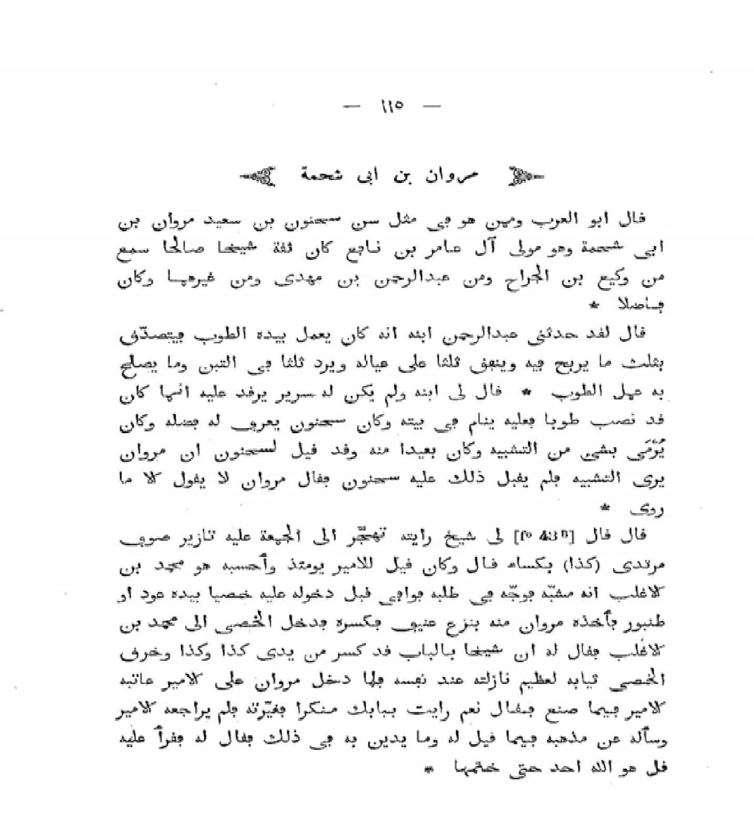 قَالَ أَبُو الْعَرَبِ: وَمِمَّنْ هُوَ فِي مِثْلِ سِنِّ سُحْنُونِ بْنِ سَعِيدٍ، مَرْوَانُ بْنُ أَبِي شَحْمَةَ، وَهُوَ مَوْلَى آلِ عَامِرِ بْنِ نَافِعٍ، كَانَ ثِقَةً، شَيْخًا، صَالِحًا.