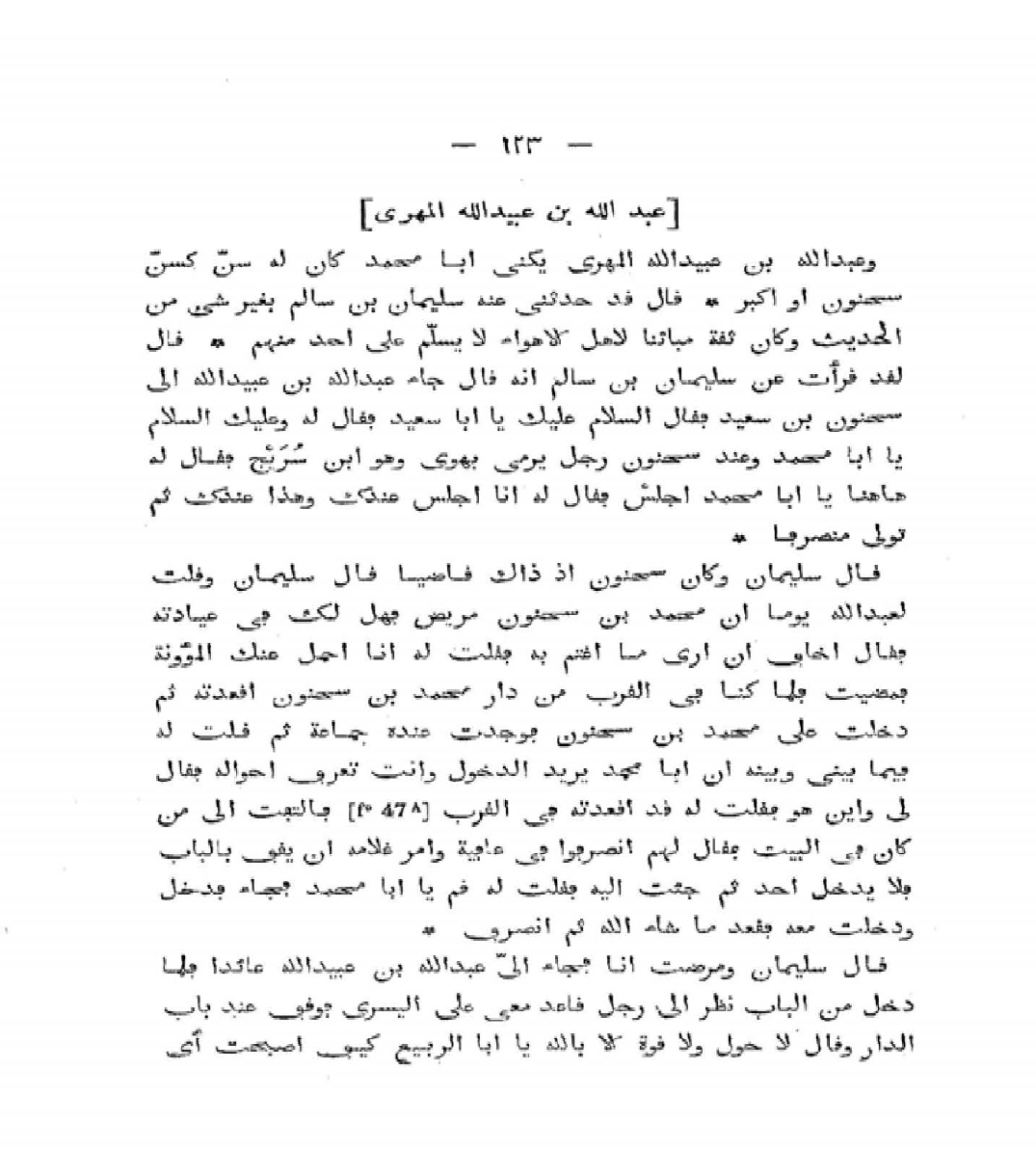 قَالَ أَبُو الْعَرَبِ: لَقَدْ قَرَأْتُ عَنْ سُلَيْمَانَ بْنِ سَالِمٍ , أَنَّهُ قَالَ: جَاءَ عَبْدُ اللَّهِ بْنُ عُبَيْدِ اللَّهِ إِلَى سُحْنُونِ بْنِ سَعِيدٍ، فَقَالَ: السَّلامُ عَلَيْكُمْ يَا أَبَا سَعِيدٍ، فَقَالَ لُه: وَعَلَيْكَ السَّلامُ يَا أَبَا مُحَمَّدٍ، وَعِنْدَ سُحْنُونٍ رَجُلٌ يُرْمَى بِهَوًى، وَهُوَ ابْنُ سُرَيْجٍ، فَقَالَ لَهُ: هَهُنَا يَا أَبَا مُحَمَّدٍ، اجْلِسْ، فَقَالَ لَهُ: أَنَا أَجْلِسُ عِنْدَكَ وَهَذَا عِنْدَكَ؟ ثُمَّ تَوَلَّى مُنْصَرِفًا.