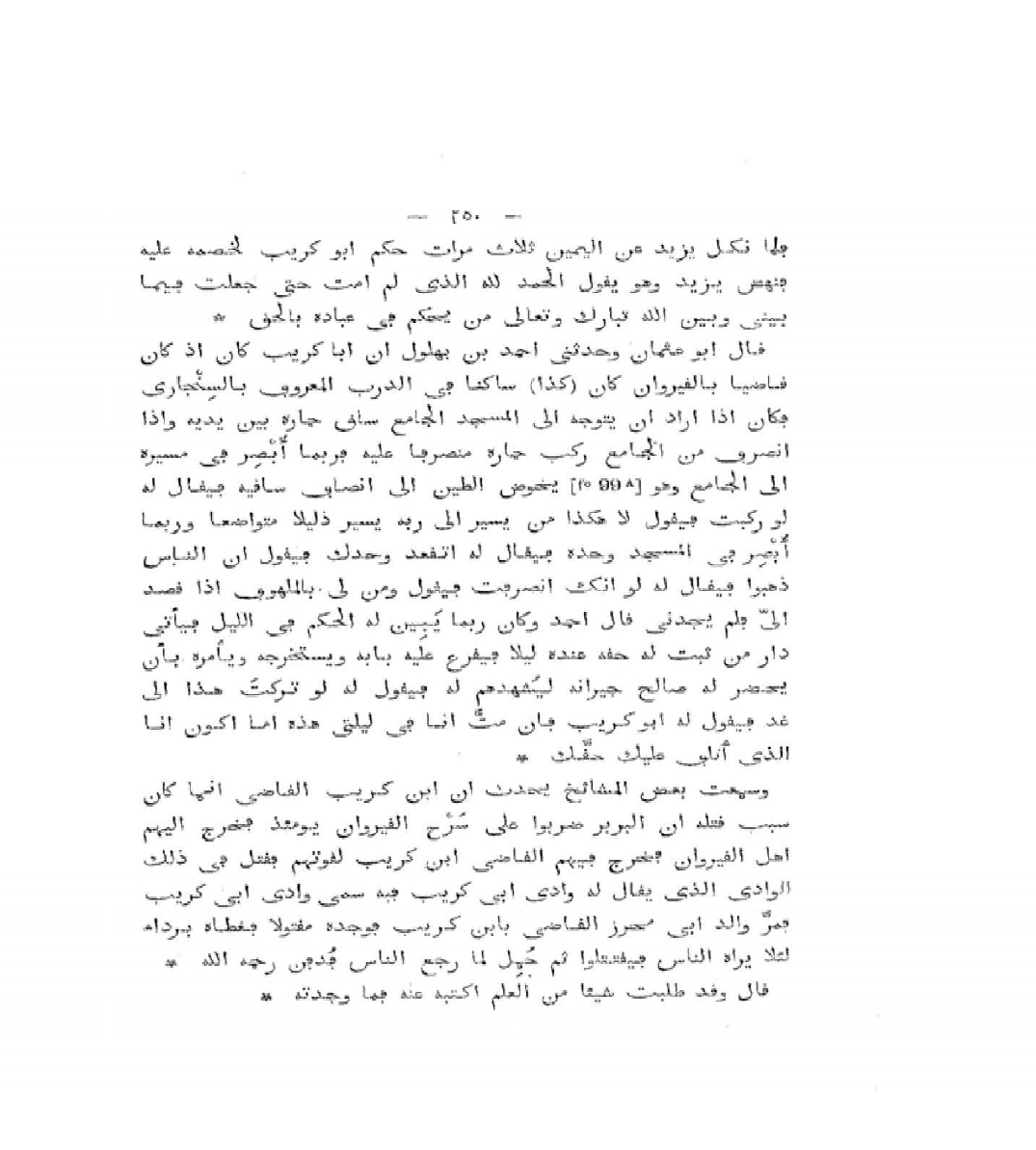 وَرُبَّمَا أُبْصِرَ فِي الْمَسْجِدِ وَحْدَهُ، فَيُقَالُ لَهُ: أَتَقْعُدُ وَحْدَكَ؟ فَيَقُولُ: إِنَّ النَّاسَ ذَهَبُوا، فَيُقَالُ لَهُ: لَوْ أَنَّكَ انْصَرَفْتَ؟ فَيَقُولُ: وَمَنْ لِي بِالْمَلْهُوفِ إِذَا قَصَدَ إِلَيَّ فَلَمْ يَجِدْنِي؟ قَالَ أَحْمَدُ بْنُ بُهْلُولٍ: وَكَانَ رُبَّمَا يَتَبَيَّنُ لَهُ الْحُكْمُ فِي اللَّيْلِ فَيَأْتِي دَارَ مَنْ ثَبُتَ لَهُ حَقُّهُ عِنْدَهُ لَيْلا، فَيَقْرَعُ عَلَيْهِ بَابَهُ، وَيَسْتَخْرِجُهُ، وَيَأْمُرُهُ بِأَنْ يُحْضِرَ لَهُ صَالِحَ جِيرَانِهِ لِيُشْهِدَهُمْ لَهُ، فَيَقُولُ لَهُ: لَوْ تَرَكْتَ هَذَا إِلَى غَدٍ، فَيَقُولُ لَهُ أَبُو كُرَيْبٍ: فَإِنْ مِتُّ أَنَا فِي لَيْلَتِي هَذِهِ أَمَا أَكُونُ أَنَا الَّذِي أَتْلَفَ عَلَيْكَ حَقَّكَ؟ وَسَمِعْتُ بَعْضَ الْمَشَائِخِ يُحَدِّثُ أَنَّ أَبَا كُرَيْبٍ الْقَاضِيَ، إِنَّمَا كَانَ سَبَبُ قَتْلِهِ أَنَّ الْبَرْبَرَ ضَرَبُوا عَلَى سَرْحِ الْقَيْرَوَانِ يَوْمَئِذٍ، فَخَرَجَ إِلَيْهِمْ أَهْلُ الْقَيْرَوَانِ فَخَرَجَ فِيهِمُ الْقَاضِي ابْنُ كُرَيْبٍ لِقُوَّتِهِمْ، فَقُتِلَ فِي ذَلِكَ الْوَادِي الَّذِي يُقَالُ لَهُ: وَادِي أَبِي كُرَيْبٍ، فَبِهِ سُمِّيَ: وَادِي أَبِي كُرَيْبٍ، فَمَرَّ وَالِدُ أَبِي مُحْرِزٍ الْقَاضِي بِابْنِ كُرَيْبٍ، فَوَجَدَهُ مَقْتُولا فَغَطَّاهُ بِرِدَاءٍ لِئَلا يَرَاهُ النَّاسُ فَيَقْتَتِلُوا، ثُمَّ حُمِلَ لَمَّا رَجَعَ النَّاسُ فَدُفِنَ، رَحِمَهُ اللَّهُ.