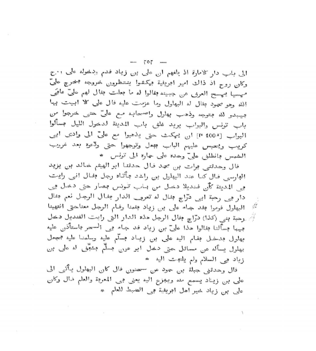 قَالَ أَبُو الْعَرَبِ: وَحَدَّثَنِي فُرَاتُ بْنُ مُحَمَّدٍ، قَالَ: حَدَّثَنَا أَبُو الْهَيْثَمِ خَالِدُ بْنُ يَزِيدَ الْفَارِسِيُّ، قَالَ: كُنَّا عِنْدَ الْبُهْلُولِ بْنِ رَاشِدٍ فَأَتَاهُ رَجُلٌ، فَقَالَ: إِنِّي رَأَيْتُ فِي الْمَنَامِ كَأَنَّ قِنْدِيلا دَخَلَ مِنْ بَابِ تُونُسَ، فَسَارَ حَتَّى دَخَلَ فِي دَارٍ فِي رَحْبَةِ بَنِي دَرَّاجٍ، فَقَالَ لَهُ: أَتَعْرِفُ الدَّارَ؟ فَقَالَ الرَّجُلُ: نَعَمْ، فَقَالَ الْبُهْلُولُ: قُومُوا فَقَدْ جَاءَ عَلِيُّ بْنُ زِيَادٍ، فَقُمْنَا وَقَامَ الرَّجُلُ مَعَنَا حَتَّى انْتَهَيْنَا إِلَى رَحْبَةِ ابْنِ دَرَّاجٍ، فَقَالَ الرَّجُلُ: هَذِهِ الدَّارُ الَّتِي رَأَيْتُ الْقِنْدِيلَ دَاخِلا فِيهَا، فَسَأَلْنَا فَقَالُوا: هَذَا عَلِيُّ بْنُ زِيَادٍ قَدْ جَاءَ فِي السَّحَرِ، فَاسْتَأْذَنَ عَلَيْهِ بُهْلُولٌ، فَدَخَلَ، فَقَامَ إِلَيْهِ عَلِيُّ بْنُ زِيَادٍ، فَسَلَّمَ عَلَيْهِ وَسَلَّمْنَا عَلَيْهِ، فَجَعَلَ بُهْلُولٌ يَسْأَلُهُ عَنْ مَسَائِلَ حَتَّى دَخَلَ أَبُو مُحْرِزٍ، فَسَلَّمَ، فَشَفَّفَ لَهُ عَلِيُّ بْنُ زِيَادٍ فِي السَّلامِ وَلَمْ يَلْتَفِتْ إِلَيْهِ.