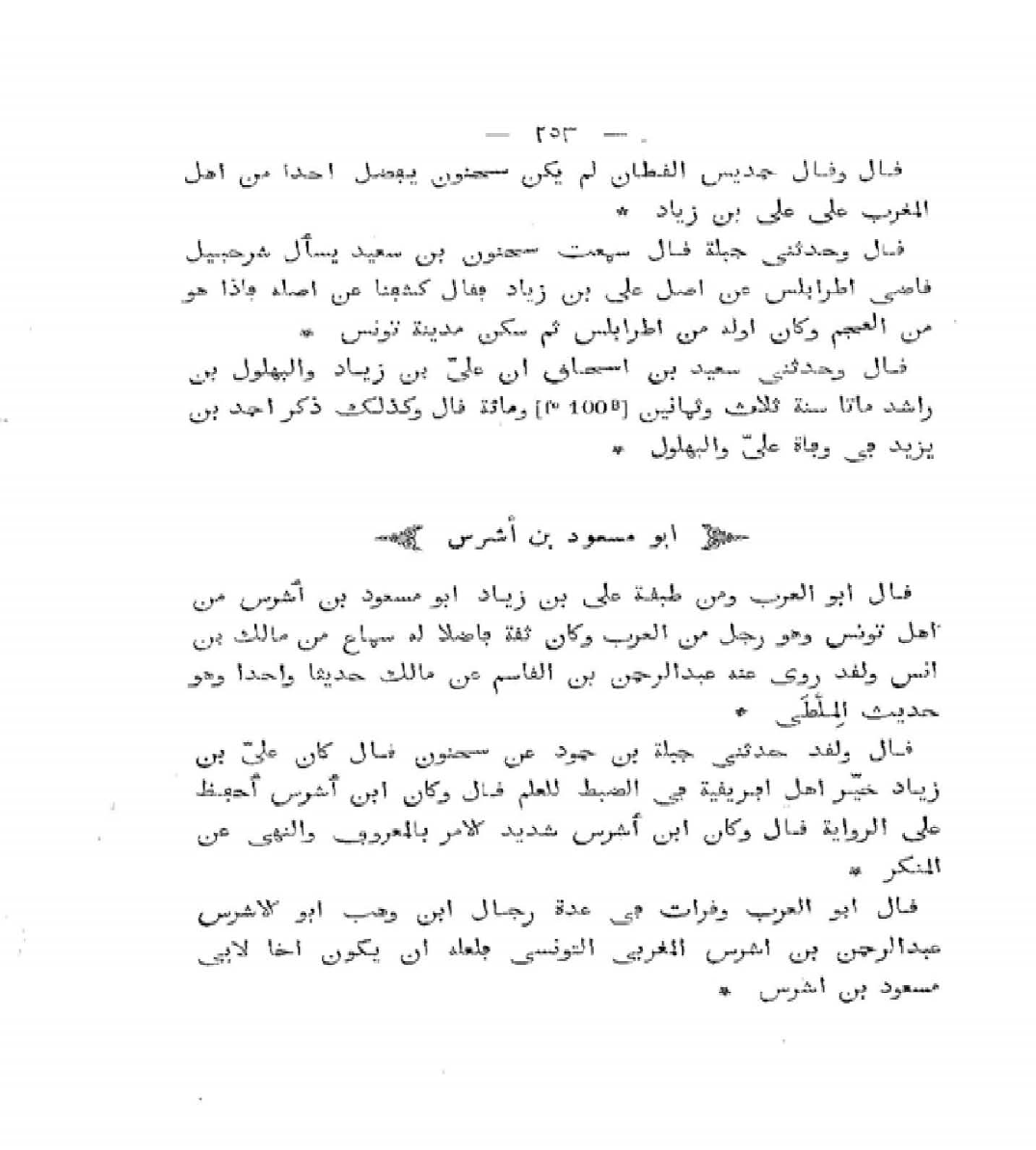 قَالَ أَبُو الْعَرَبِ: وَمِنْ طَبَقَةِ عَلِيِّ بْنِ زِيَادٍ، أَبُو مَسْعُودِ بْنُ أَشْرَسَ مِنْ أَهْلِ تُونُسَ، وَهُوَ رَجُلٌ مِنَ الْعَرَبِ وَكَانَ ثِقَةً فَاضِلا، لَهُ سَمَاعٌ مِنْ مَالِكِ بْنِ أَنَسٍ، وَلَقَدْ رَوَى عَنْهُ عَبْدُ الرَّحْمَنِ بْنُ الْقَاسِمِ، عَنْ مَالِكٍ، حَدِيثًا وَاحِدًا وَهُوَ حَدِيثُ الْمَلْطِيِّ.