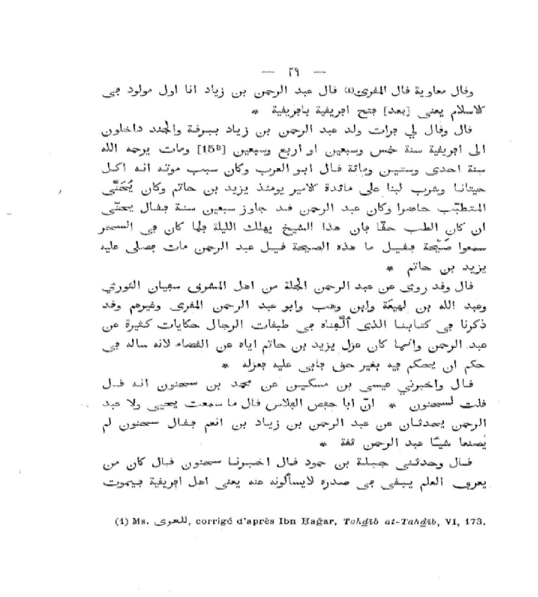 وَقَالَ مُعَاوِيَةُ الصُّمَادِحِيُّ: قَالَ أَبُو عَبْدِ الرَّحْمَنِ الْمُقْرِي: قَالَ عَبْدُ الرَّحْمَنِ بْنُ زِيَادٍ: " أَنَا أَوَّلُ مَوْلُودٍ فِي الإِسْلامِ، يَعْنِي: بَعْدَ فَتْحِ إِفْرِيقِيَّةَ، بِإِفْرِيقِيَّةَ.