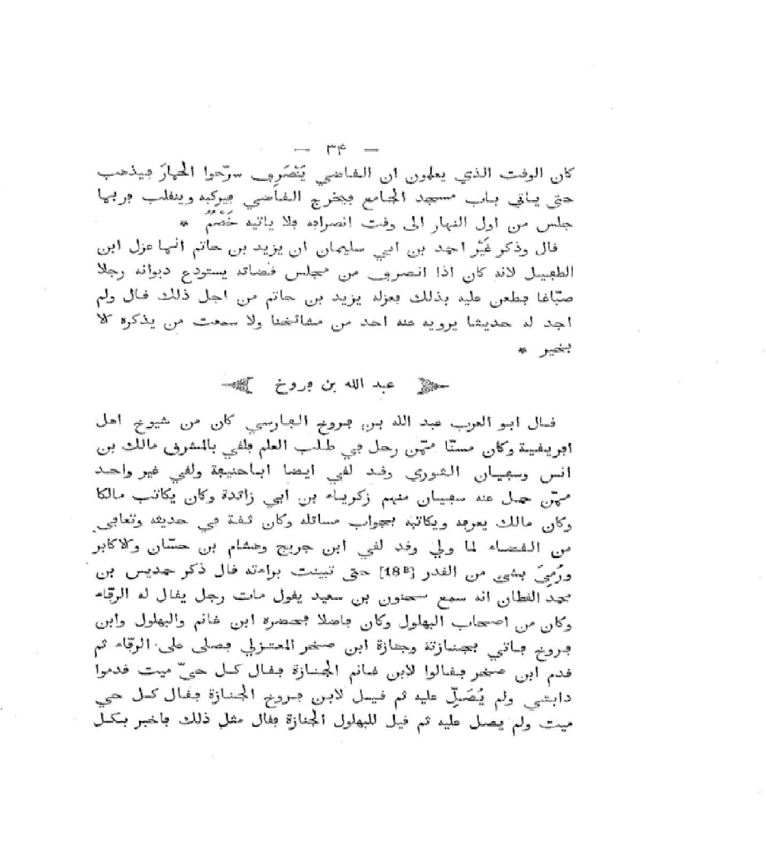 قَالَ أَبُو الْعَرَبِ: عَبْدُ اللَّهِ بْنُ فَرُّوخَ الْفَارِسِيُّ، كَانَ مِنْ شُيُوخِ أَهْلِ إِفْرِيقِيَّةَ، وَكَانَ مُسِنًّا مِمَّنْ رَحَلَ فِي طَلَبِ الْعِلْمِ، فَلَقِيَ بِالْمَشْرِقِ مَالِكَ بْنَ أَنَسٍ، وَسُفْيَانَ الثَّوْرِيَّ، وَقَدْ لَقِيَ أَيْضًا أَبَا حَنِيفَةَ، وَلَقِيَ غَيْرَ وَاحِدٍ مِمَّنْ حَمَلَ عَنْ سُفْيَانَ، مِنْهُمْ زَكَرِيَّاءُ بْنُ أَبِي زَائِدَةَ، وَكَانَ يُكَاتِبُ مَالِكًا، وَكَانَ مَالِكٌ يَعْرِفُهُ وَيُكَاتِبُهُ بِجَوَابِ مَسَائِلِهِ، وَكَانَ ثِقَةً فيِ حَدِيثِهِ، وَتَعَافَى مِنَ الْقَضَاءِ لَمَّا وَلِيَ، وَقَدْ لَقِيَ عَبْدَ الْمَلِكِ بْنَ عَبْدِ الْعَزِيزِ بْنِ جُرَيْجٍ، وَهِشَامَ بْنَ حَسَّانٍ وَالأَكَابِرَ، وَرُمِيَ بِشَيْءٍ مِنَ الْقَدَرِ حَتَّى تَبَيَّنَتْ بَرَاءَتُهُ.