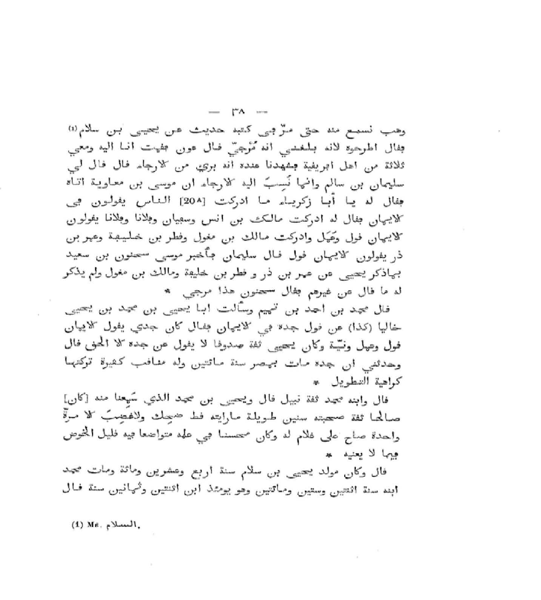 وَهْبٍ نَسْمَعُ مِنْهُ حَتَّى مَرَّ فِي كُتُبِه حَدِيثٌ عَنْ يَحْيَى بْنِ سَلامٍ، فَقَالَ: اطْرَحُوهُ لأَنَّهُ بَلَغَنِي أَنَّهُ مُرْجِئٌ، قَالَ عَوْنٌ: فَقُمْتُ أَنَا إِلَيْهِ وَمَعِي ثَلاثَةٌ مِنْ أَهْلِ إِفْرِيقِيَّةَ، فَشَهِدْنَا عَنْهُ أَنَّهُ بَرِئٌ مِنَ الإِرْجَاءِ، قَالَ أَبُو الْعَرَبِ: قَالَ لِي سُلَيْمَانُ بْنُ سَالِمٍ: وَإِنَّمَا نُسِبَتْ إِلَيْهِ الإِرْجَاءُ، أَنَّ مُوسَى بْنَ مُعَاوِيَةَ الصُّمَادِحِيَّ أَتَاهُ، فَقَالَ لَهُ: يَا أَبَا زَكَرِيَّاءَ، مَا أَدْرَكْتَ النَّاسَ يَقُولُونَ فِي الإِيمَانِ؟ فَقَالَ لَهُ: أَدْرَكْتُ مَالِكًا، وَسُفْيَانَ الثَّوْرِيَّ، يَقُولُونَ: «الإِيمَانُ قَوْلٌ وَعَمَلٌ» ، وَأَدْرَكْتُ مَالِكَ بْنَ مِغْوَلٍ، وَقَطَرَ بْنَ خَلِيفَةَ، وَعُمَرَ بْنَ ذَرٍّ، يَقُولُونَ: «الإِيمَانُ قَوْلٌ» .