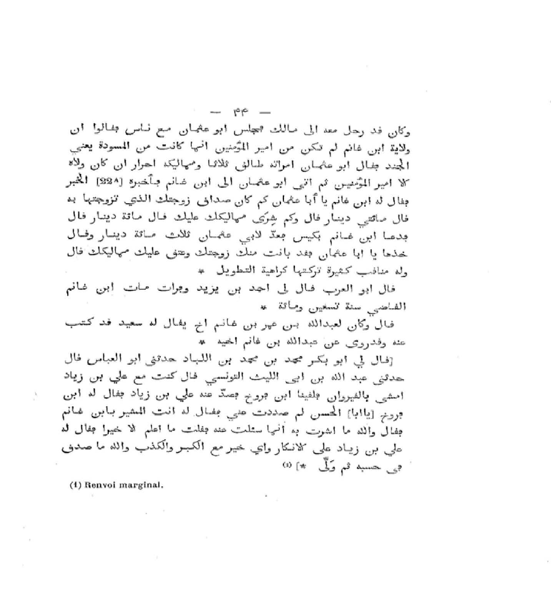 وَكَانَ قَدْ رَحَلَ مَعَهُ إِلَى مَالِكٍ، فَجَلَسَ أَبُو عُثْمَانَ مَعَ نَاسٍ، فَتَكَلَّمُوا فِي وِلايَةِ ابْنِ غَانِمٍ، قَالَ بَعْضُهُمْ: إِنَّ وِلايَةَ ابْنِ غَانِمٍ لَمْ تَكُنْ مِنْ أَمِيرِ الْمُؤْمِنِينَ، إِنَّمَا كَانَتْ مِنَ الْمُسَوِّدَةِ، يَعْنِي: الْجُنْدَ، فَقَالَ أَبُو عُثْمَانَ: امْرَأَتُهُ طَالِقٌ ثَلاثًا، وَمَمَالِيكُهُ أَحْرَارٌ، إِنْ كَانَ وَلاهُ إِلا أَمِيرُ الْمُؤْمِنِينَ، ثُمَّ أَتَى أَبُو عُثْمَانَ إِلَى ابْنِ غَانِمٍ، فَأَخْبَرَهُ الْخَبَرَ، فَقَالَ لَهُ ابْنُ غَانِمٍ: يَا أَبَا عُثْمَانَ، كَمْ صَدَاقُ زَوْجَتِكَ الَّذِي تَزَوَّجْتَهَا بِهِ؟ قَالَ: مِائَتَا دِينَارٍ، قَالَ: «وَكَمْ شِرَى مَمَالِيكِكَ عَلَيْكَ؟» قَالَ: «مِائَةُ دِينَارٍ» قَالَ: فَدَعَا ابْنُ غَانِمٍ بِكِيسٍ فَعَدَّ لأَبِي عُثْمَانَ ثَلاثَ مِائَةِ دِينَارٍ، وَقَالَ: خُذْهَا يَا أَبَا عُثْمَانَ، فَقَدْ بَانَتْ مِنْكَ زَوْجَتُكَ، وَعُتِقَ عَلَيْكَ مَمَالِيكُكَ ".
