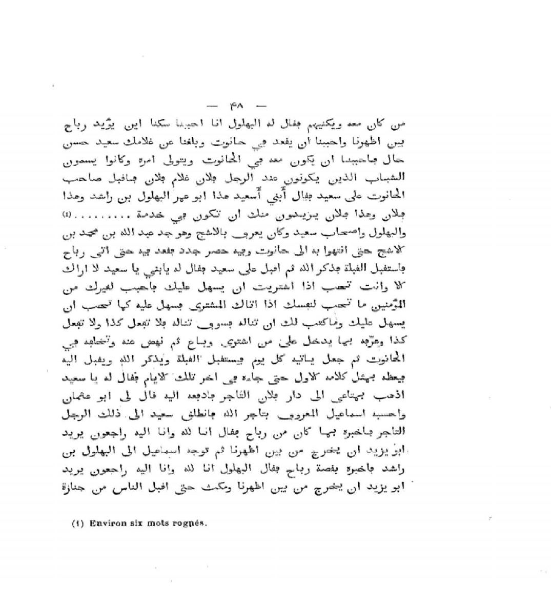 مَنْ كَانَ مَعَهُمْ وَيُكَنِّيهِمْ، فَقَالَ لَهُ الْبُهْلُولُ: إِنَّا أَحْبَبْنَا سُكْنَى أَبِي يَزِيدَ رَبَاحٍ بَيْنَ أَظْهُرِنَا، وَأَحْبَبْنَا أَنْ يَقْعُدَ فِي حَانُوتٍ، وَبَلَغَنَا عَنْ غُلامِكَ سَعِيدٍ حُسْنُ حَالٍ، فَأَحْبَبْنَا أَنْ يَكُونَ مَعَهُ فِي الْحَانُوتِ وَيَتَوَلَّى أَمْرَهُ، وَكَانُوا يُسَمُّونَ الشَّبَابَ الَّذِينَ يَكُونُونَ عِنْدَ الرَّجُلِ: فُلانًا غُلامَ فُلانٍ، فَأَقْبَلَ صَاحِبُ الْحَانُوتِ عَلَى سَعِيدٍ، فَقَالَ: أَبُنَيَّ، أَسَعِيدُ، هَذَا أَبُو عَمْرٍو الْبُهْلُولُ بْنُ رَاشِدٍ، وَهَذَا فُلانٌ، وَهَذَا فُلانٌ، يُرِيدُونَ مِنْكَ أَنْ تَكُونَ فِي خِدْمَةِ. . . . . . . وَالْبُهْلُول أَصْحَاب سَعِيدٍ، وَكَانَ يُعْرَفُ بِالأَشْبَجِ، وَهُوَ عَبْدُ اللَّهِ بْنُ مُحَمَّدِ بْنِ الأَشْبَجِ، حَتَّى انْتَهَوْا بِهِ إِلَى حَانُوتٍ، وَفِيهِ حُصُرٌ جُدُدٌ، فَقَعَدَ فِيهِ حَتَّى أَتَى رَبَاحٌ فَاسْتَقْبَلَ الْقِبْلَةَ، فَذَكَرَ اللَّهَ ثُمَّ أَقْبَلَ عَلَى سَعِيدٍ، فَقَالَ لَهُ: يَا بُنَيَّ، يَا سَعِيدُ، لا أَرَاكَ إِلا وَأَنْتَ تُحِبُّ إِذَا اشْتَرَيْتَ، أَنْ يُسَهَّلَ عَلَيْكَ، فَأَحْبِبْ لِغَيْرِكَ مِنَ الْمُؤْمِنِينَ مَا تُحِبُّ لِنَفْسِكَ، إِذَا أَتَاكَ الْمُشْتَرِي فَسَهِّلْ عَلَيْهِ كَمَا تُحِبُّ أَنْ يُسَهَّلَ عَلَيْكَ، وَمَا كُتِبَ لَكَ أَنْ تَنَالَهُ فَسَوْفَ تَنَالَهُ، فَلا تَفْعَلْ كَذَا، أَوْ لا تَفْعَلْ كَذَا، وَعَرَّفَهُ بِمَا يَدْخُلُ عَلَى مَنِ اشْتَرَى وَبَاعَ، ثُمَّ نَهَضَ عَنْهُ وَخَلَّفَهُ فِي الْحَانُوتِ، ثُمَّ جَعَلَ يَأْتِيهِ كُلَّ يَوْمٍ فَيَسْتَقْبِلُ الْقِبْلَةَ، وَيَذْكُرُ اللَّهَ، وَيُقْبِلُ إِلَيْهِ فَيَعِظُهُ بِمِثْلِ كَلامِهِ الأَوَّلِ، حَتَّى جَاءَهُ فِي آخِرِ تِلْكَ الأَيَّامِ، فَقَالَ لَهُ: يَا سَعِيدُ، اذْهَبْ بِمَتَاعِي إِلَى دَارِ فُلانٍ التَّاجِرِ، فَادْفَعْهُ إِلَيْهِ، قَالَ لِي أَبُو عُثْمَانَ بْنُ الْحَدَّادِ: وَأَحْسَبُهُ إِسْمَاعِيلَ الْمَعْرُوفَ بِتَاجِرِ اللَّهِ، فَانْطَلَقَ سَعِيدٌ إِلَى ذَلِكَ الرَّجُلِ التَّاجِرِ، فَأَخْبَرَهُ بِمَا كَانَ مِنْ رَبَاحٍ،