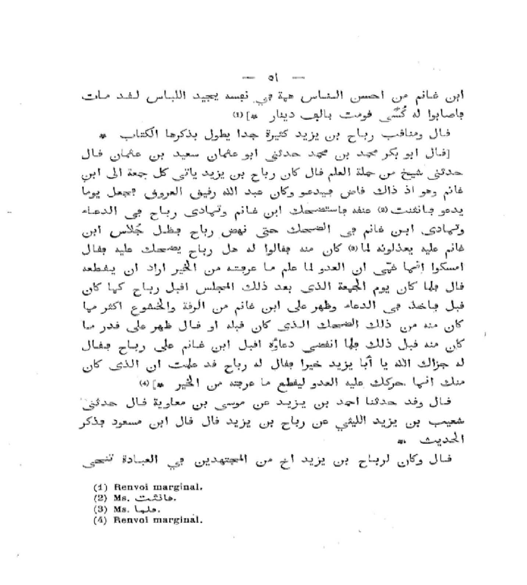 قَالَ أَبُو بَكْرٍ مُحَمَّدُ بْنُ مُحَمَّدٍ: حَدَّثَنِي أَبُو عُثْمَانَ سَعِيدُ بْنُ مُحَمَّدٍ، قَالَ: حَدَّثَنِي شَيْخٌ مِنْ حَمَلَةِ الْعِلْمِ، قَالَ: كَانَ رَبَاحُ بْنُ يَزِيدَ، يَأْتِي كُلَّ جُمُعَةٍ إِلَى ابْنِ غَانِمٍ، وَهُوَ إِذْ ذَاكَ قَاضٍ فَيَدْعُو، وَكَانَ رَبَاحٌ رَقِيقَ الْعُرُوقِ، فَجَعَلَ يَوْمًا يَدْعُو فَانْثَنَتْ عُنُقُهُ، فَاسْتَضْحَكَ ابْنُ غَانِمٍ، وَتَمَادَى رَبَاحٌ فِي الدُّعَاءِ، وَتَمَادَى ابْنُ غَانِمٍ فِي الضَّحِكِ، حَتَّى نَهَضَ رَبَاحٌ، فَظَلَّ جُلاسُ ابْنِ غَانِمٍ عِنْدَهُ، يَعْذِلُونَهُ لِمَا كَانَ مِنْهُ، فَقَالُوا لَهُ: هَلْ رَبَاحٌ يُضْحَكُ عَلَيْهِ؟ فَقَالَ: أَمْسِكُوا، إِنَّمَا غَمِّي أَنَّ الْعَدُوَّ لَمَّا عَلِمَ مَا عَرَفْتُهُ مِنَ الْخَيْرِ أَرَادَ أَنْ يَقْطَعَهُ، قَالَ الشَّيْخُ: فَلَمَّا كَانَ يَوْمُ الْجُمُعَةِ الَّذِي بَعْدَ ذَلِكَ الْمَجْلِسِ أَقْبَلَ رَبَاحٌ، كَمَا كَانَ قَبْلُ، فَأَخَذَ فِي الدُّعَاءِ، فَظَهَرَ عَلَى ابْنِ غَانِمٍ مِنَ الرِّقَّةِ وَالْخُشُوعِ، أَكْثَرُ مِمَّا كَانَ مِنْهُ مِنْ ذَلِكَ الضَّحِكِ الَّذِي كَانَ قَبْلَهُ، أَوْ قَالَ: ظَهَرَ عَلَى قَدْرِ مَا كَانَ مِنْهُ قَبْلَ ذَلِكَ، فَلَمَّا انْقَضَى دُعَاؤُهُ أَقْبَلَ ابْنُ غَانِمٍ عَلَى رَبَاحٍ، فَقَالَ لَهُ: جَزَاكَ اللَّهُ يَا أَبَا يَزِيدَ خَيْرًا، فَقَالَ لَهُ رَبَاحٌ: قَدْ عَلِمْتُ أَنَّ الَّذِي كَانَ مِنْكَ إِنَّمَا حَرَّكَكَ عَلَيْهِ الْعَدُوُّ لِيَقْطَعَ مَا عَرَفْتَهُ مِنَ الْخَيْرِ.
