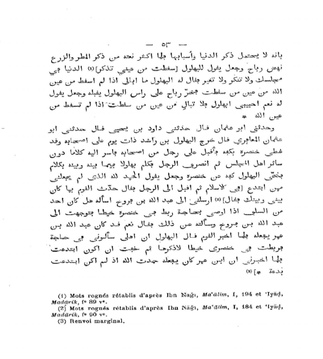 وَحَدَّثَنِي أَبُو عُثْمَانَ سَعِيدُ بْنُ مُحَمَّدٍ، قَالَ: حَدَّثَنِي دَاوُدُ بْنُ يَحْيَى، قَالَ: حَدَّثَنِي أَبُو عُثْمَانَ حَاتِمُ بْنُ عُثْمَانَ الْمَعَافِرِيُّ، قَالَ: " خَرَجَ الْبُهْلُولُ بْنُ رَاشِدٍ ذَاتَ يَوْمٍ عَلَى أَصْحَابِهِ وَقَدْ غَطَّى خِنْصَرَهُ بِكَفِّهِ، فَأَقْبَلَ عَلَى رَجُلٍ مِنْ أَصْحَابِهِ، فَأَسَرَّ إِلَيْهِ كَلامًا دُونَ سَائِرِ أَهْلِ الْمَجْلِسِ، ثُمَّ انْصَرَفَ الرَّجُلُ، ثُمَّ عَادَ إِلَيْهِ فَكَلَّمَهُ، فِيمَا بَيْنَهُ وَبَيْنَهُ بِكَلامٍ، فَنَحَّى الْبُهْلُولُ كَفَّهُ، عَنْ خِنْصَرِهِ، وَجَعَلَ يَقُولُ: الْحَمْدُ لِلَّهِ الَّذِي لَمْ يَجْعَلْنِي أَبْتَدِعُ فِي الإِسْلامِ، ثُمَّ أَقْبَلَ إِلَى الرَّجُلِ، فَقَالَ: حَدِّثِ الْقَوْمَ بِمَا كَانَ بَيْنِي وَبَيْنَكَ، فَقَالَ: أَرْسَلَنِي إِلَى عَبْدِ اللَّهِ بْنِ فَرُّوخَ أَسْأَلُهُ، هَلْ كَانَ أَحَدٌ مِنَ السَّلَفِ إِذَا أَوْصَى بِحَاجَةٍ رَبَطَ فِي خِنْصَرِهِ خَيْطًا؟ فَتَوَجَّهْتُ إِلَى عَبْدِ اللَّهِ بْنِ فَرُّوخَ، وَسَأَلْتُهُ عَنْ ذَلِكَ، فَقَالَ: نَعَمْ، قَدْ كَانَ عَبْدُ اللَّهِ بْنُ عُمَرَ يَفْعَلُهُ، فَلَمَّا أَخْبَرَ الْقَوْمَ، قَالَ الْبُهْلُولُ: إِنَّ أَهْلِي سَأَلُونِي فِي حَاجَةٍ فَرَبَطْتُ فِي خِنْصَرِي خَيْطًا لأَذْكُرَهَا، ثُمَّ خِفْتُ أَنْ أَكُونَ ابْتَدَعْتُ، فَلَمَّا أَخْبَرَنِي أَنَّ ابْنَ عُمَرَ كَانَ يَفْعَلُهُ حَمِدْتُ اللَّهَ إِذْ لَمْ أَكُنِ ابْتَدَعْتُ بِدْعَةً.