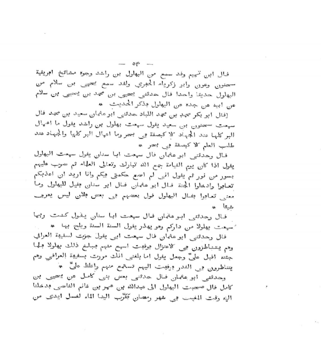 قَالَ أَبُو الْعَرَبِ: وَحَدَّثَنِي أَبُو عُثْمَانَ سَعِيدُ بْنُ مُحَمَّدٍ، قَالَ: سَمِعْتُ أَبَا سِنَانٍ، يَقُولُ: كُنْتُ رُبَّمَا سَمِعْتُ بُهْلُولَ مِنْ دَارِكُمْ وَهُوَ يَهْذِرُ، يَقُولُ: «السُّنَّةُ السُّنَّةُ، وَيُلِحُّ عَلَيْهَا» .